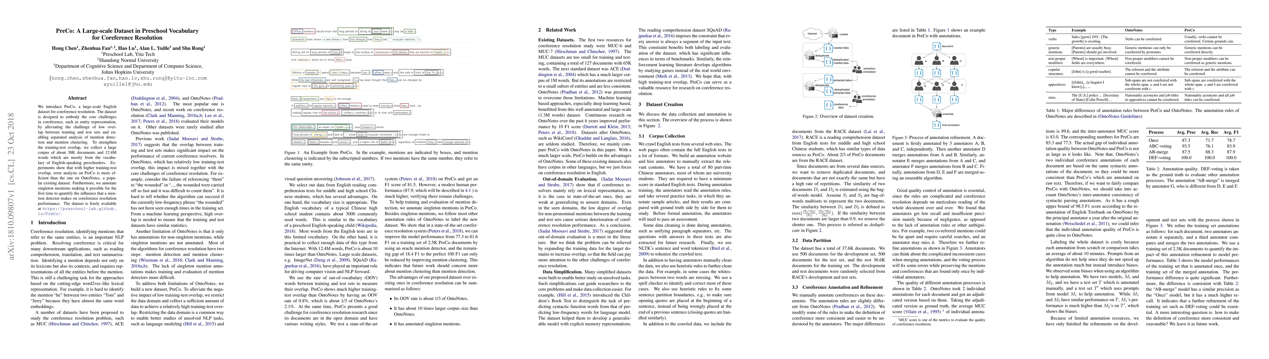 The research introduces PreCo, a large-scale English dataset for coreference resolution, designed to address challenges like low overlap between training and test sets. It utilizes a corpus of about 38K documents and 12.4M words, mostly from preschool vocabulary, to strengthen training-test overlap. The dataset also includes singleton mention annotations for quantifying the influence of mention detectors on coreference resolution performance.