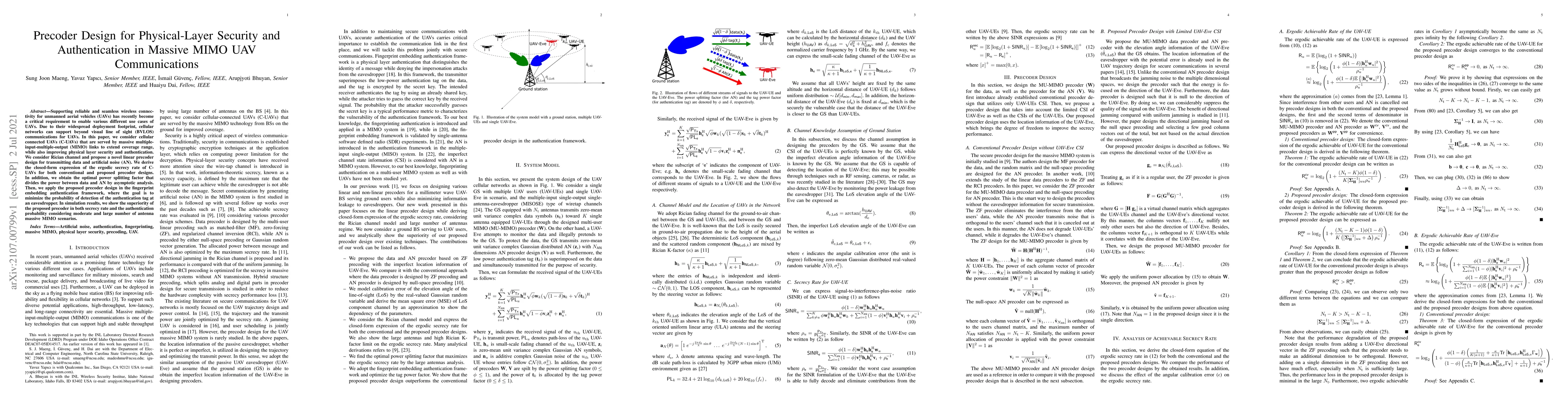 A novel linear precoder design is introduced for physical-layer security and authentication in massive MIMO UAV communications, achieving improved secrecy rates and authentication capabilities.