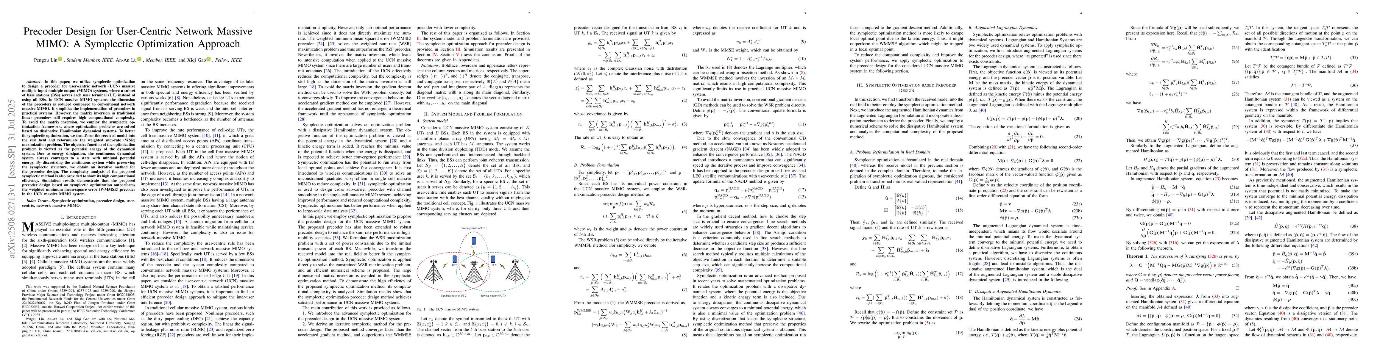 In this paper, we utilize symplectic optimization to design a precoder for user-centric network (UCN) massive multiple-input multiple-output (MIMO) systems, where a subset of base stations (BSs) serves each user terminal (UT) instead of using all BSs. In UCN massive MIMO systems, the dimension of the precoders is reduced compared to conventional network massive MIMO. It simplifies the implementation of precoders in practical systems. However, the matrix inversion in traditional linear precoders still requires high computational complexity. To avoid the matrix inversion, we employ the symplectic optimization framework, where optimization problems are solved based on dissipative Hamiltonian dynamical systems. To better fit symplectic optimization, we transform the received model into the real field and reformulate the weighted sum-rate (WSR) maximization problem. The objective function of the optimization problem is viewed as the potential energy of the dynamical system. Due to energy dissipation, the continuous dynamical system always converges to a state with minimal potential energy. By discretizing the continuous system while preserving the symplectic structure, we obtain an iterative method for the precoder design. The complexity analysis of the proposed symplectic method is also provided to show its high computational efficiency. Simulation results demonstrate that the proposed precoder design based on symplectic optimization outperforms the weighted minimum mean-square error (WMMSE) precoder in the UCN massive MIMO system.