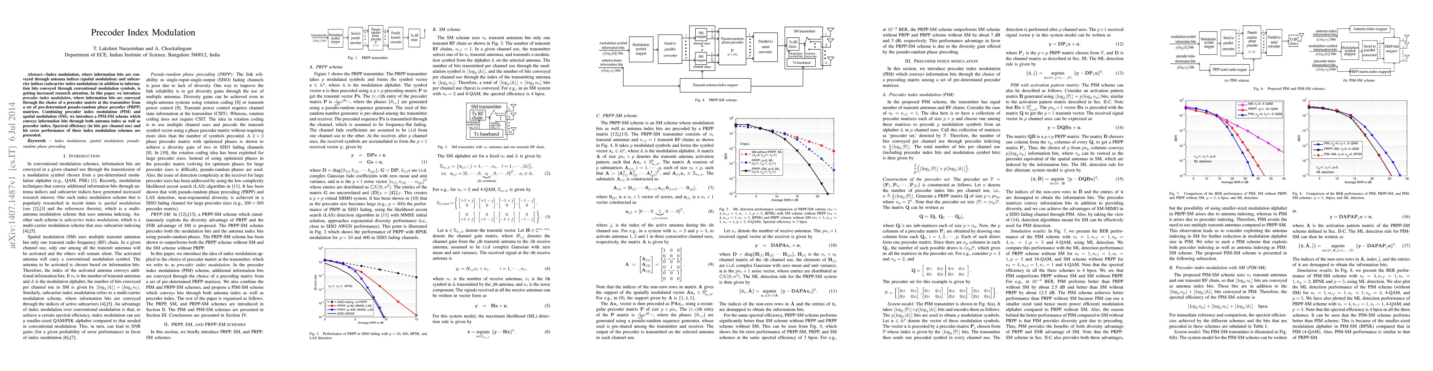 This paper introduces precoder index modulation (PIM), where information bits are conveyed via the selection of a precoder matrix from a set of pseudo-random phase precoder matrices. The authors combine PIM with spatial modulation to create a PIM-SM scheme, which uses both antenna and precoder indices to convey information, and analyze its spectral efficiency and bit error performance.