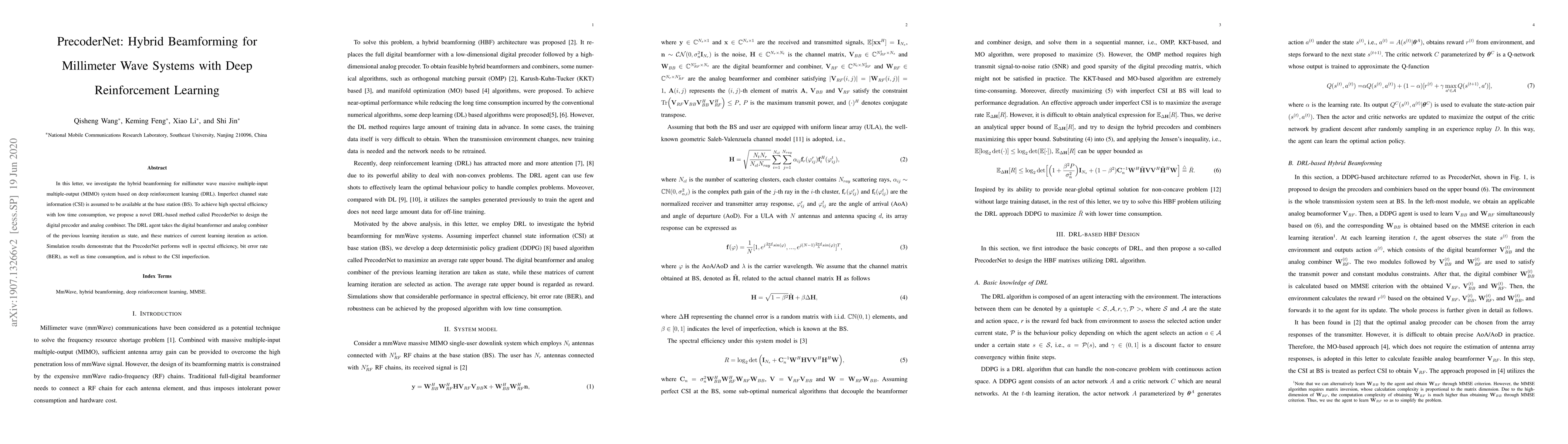 This paper proposes PrecoderNet, a deep reinforcement learning-based method for hybrid beamforming in millimeter wave MIMO systems, achieving high spectral efficiency with low time consumption. The method is robust to imperfect channel state information and demonstrates effective performance in spectral efficiency and bit error rate.