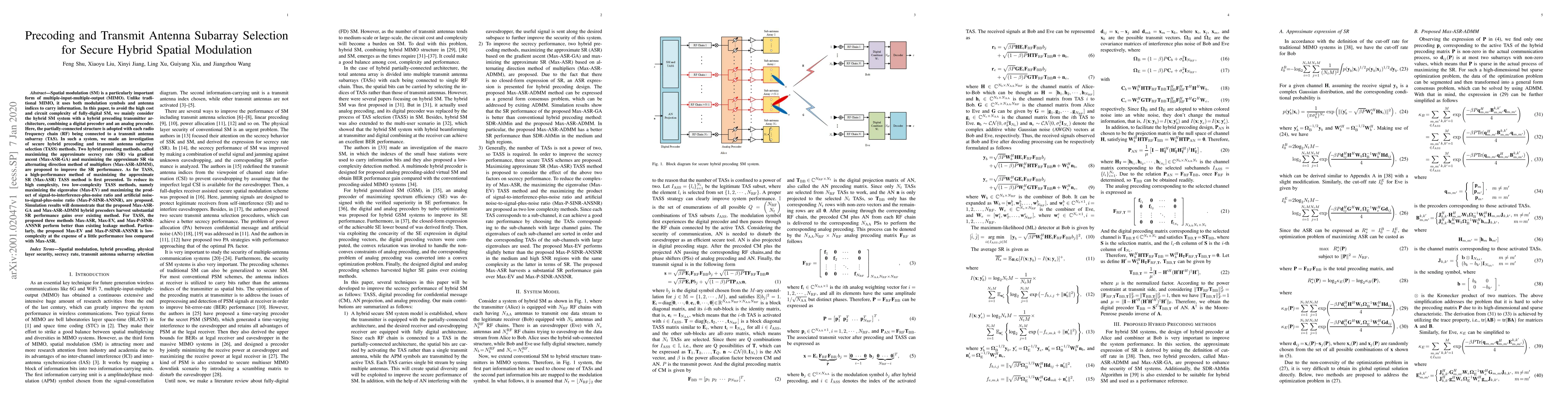 This paper proposes hybrid precoding and transmit antenna subarray selection methods for secure hybrid spatial modulation in MIMO systems. It introduces two hybrid precoding techniques and three antenna subarray selection methods to improve secrecy rate while reducing complexity. Simulation results show significant performance gains over existing methods.