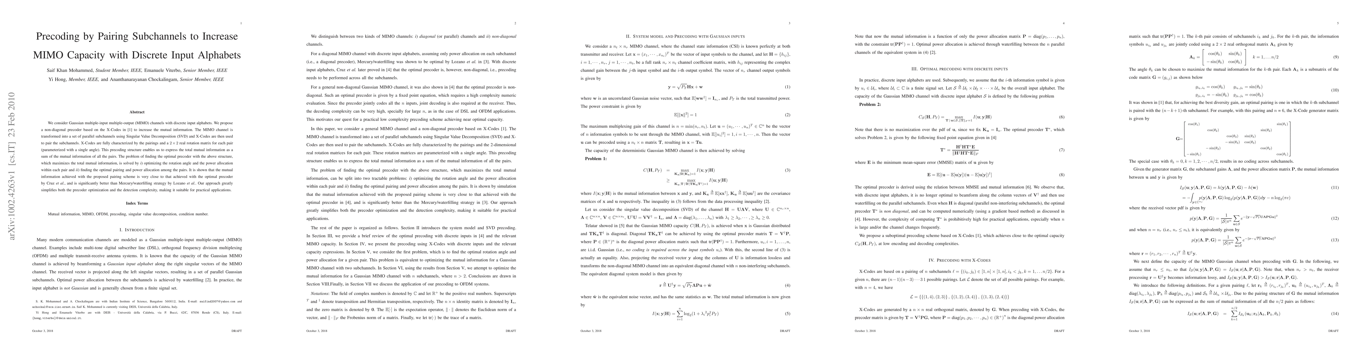 We consider Gaussian multiple-input multiple-output (MIMO) channels with discrete input alphabets. We propose a non-diagonal precoder based on the X-Codes in \cite{Xcodes_paper} to increase the mutual information. The MIMO channel is transformed into a set of parallel subchannels using Singular Value Decomposition (SVD) and X-Codes are then used to pair the subchannels. X-Codes are fully characterized by the pairings and a $2\times 2$ real rotation matrix for each pair (parameterized with a single angle). This precoding structure enables us to express the total mutual information as a sum of the mutual information of all the pairs. The problem of finding the optimal precoder with the above structure, which maximizes the total mutual information, is solved by {\em i}) optimizing the rotation angle and the power allocation within each pair and {\em ii}) finding the optimal pairing and power allocation among the pairs. It is shown that the mutual information achieved with the proposed pairing scheme is very close to that achieved with the optimal precoder by Cruz {\em et al.}, and is significantly better than Mercury/waterfilling strategy by Lozano {\em et al.}. Our approach greatly simplifies both the precoder optimization and the detection complexity, making it suitable for practical applications.