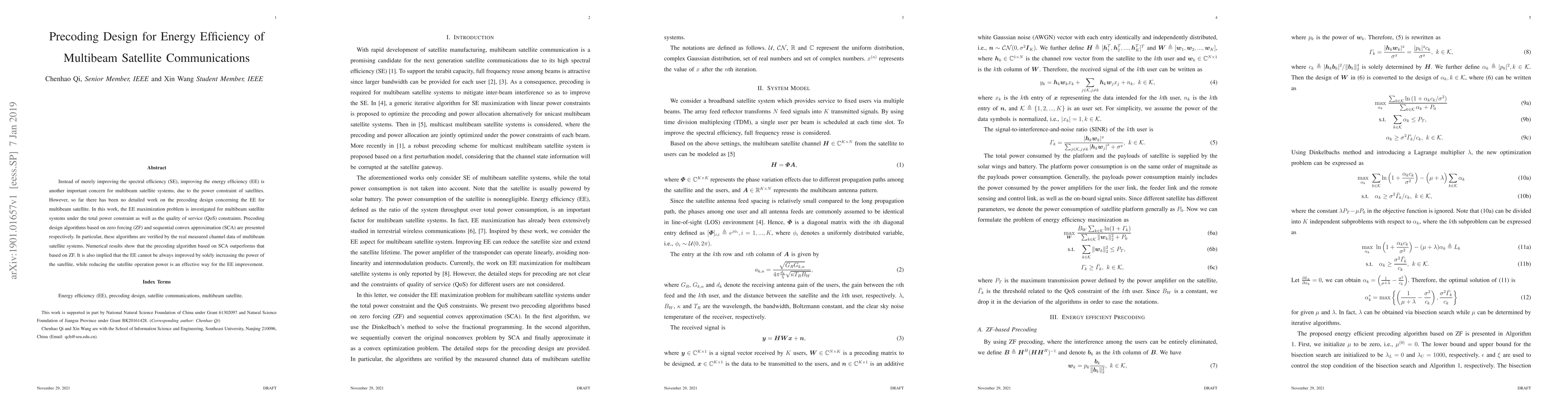 Proposes efficient precoding algorithms (ZF-based and SCA-based) for maximizing energy efficiency in multibeam satellite communications under power constraints and QoS requirements.