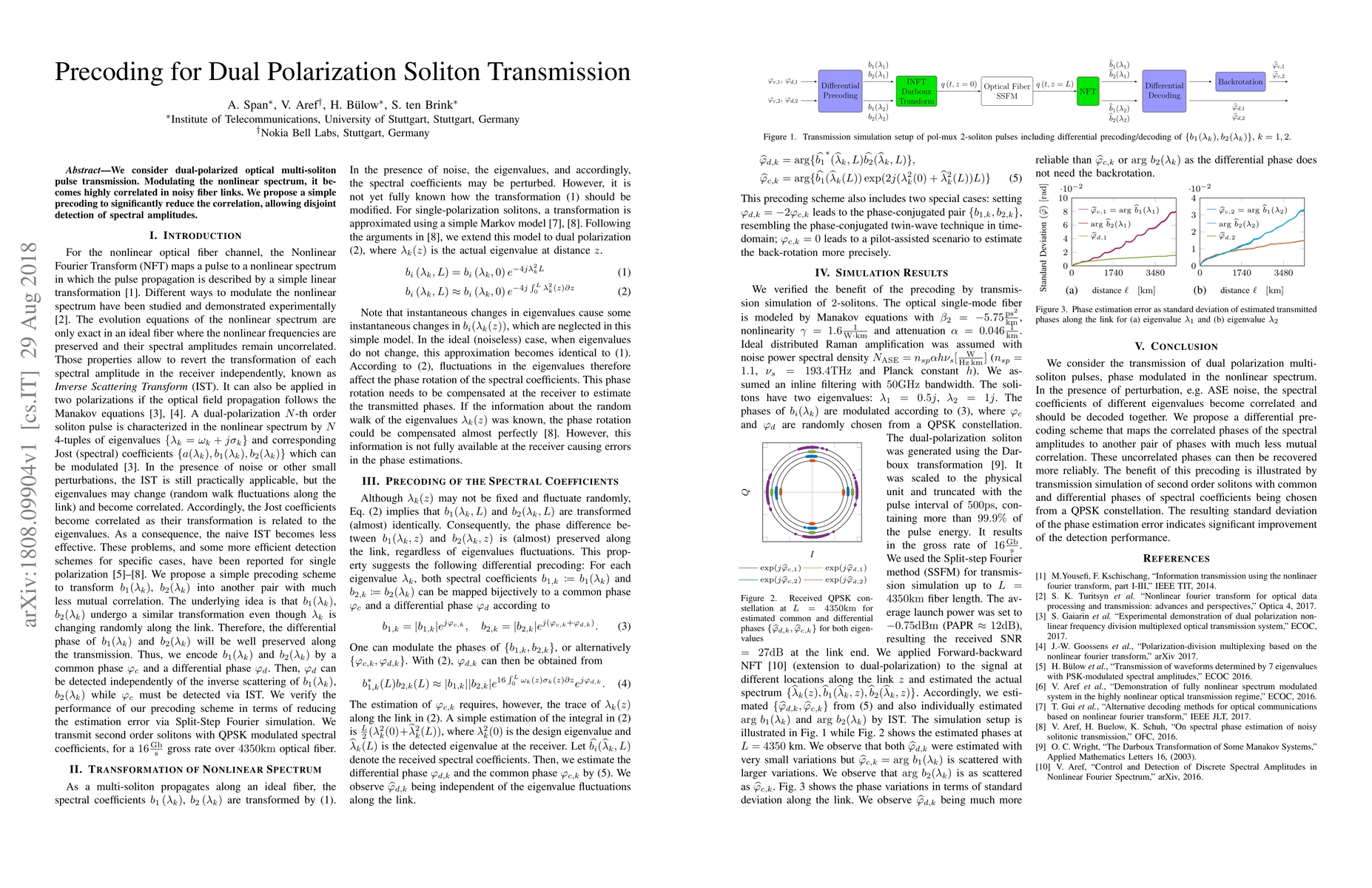 Summary: This paper proposes a precoding technique to reduce correlation in dual-polarized optical multi-soliton pulse transmission, enhancing spectral amplitude detection in noisy fiber links. The method aims to improve soliton transmission efficiency by mitigating nonlinear spectrum modulation effects.