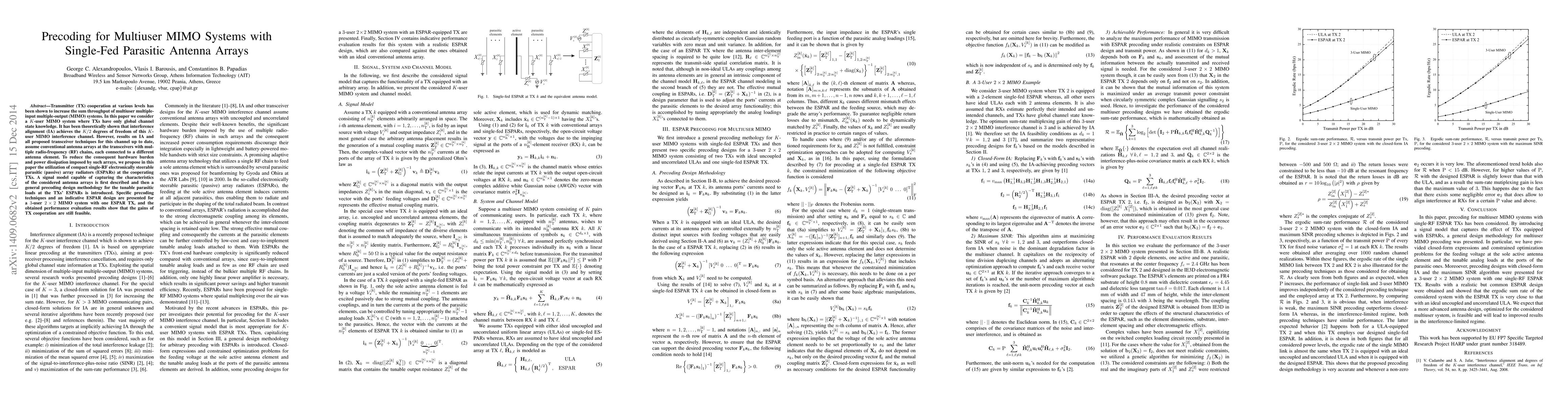 This paper proposes a precoding methodology for K-user multiuser MIMO systems utilizing single-RF electronically steerable parasitic array radiators (ESPARs) to reduce hardware burden and power dissipation. The study demonstrates that TX cooperation and interference alignment can still achieve significant gains in sum throughput despite the use of ESPARs.