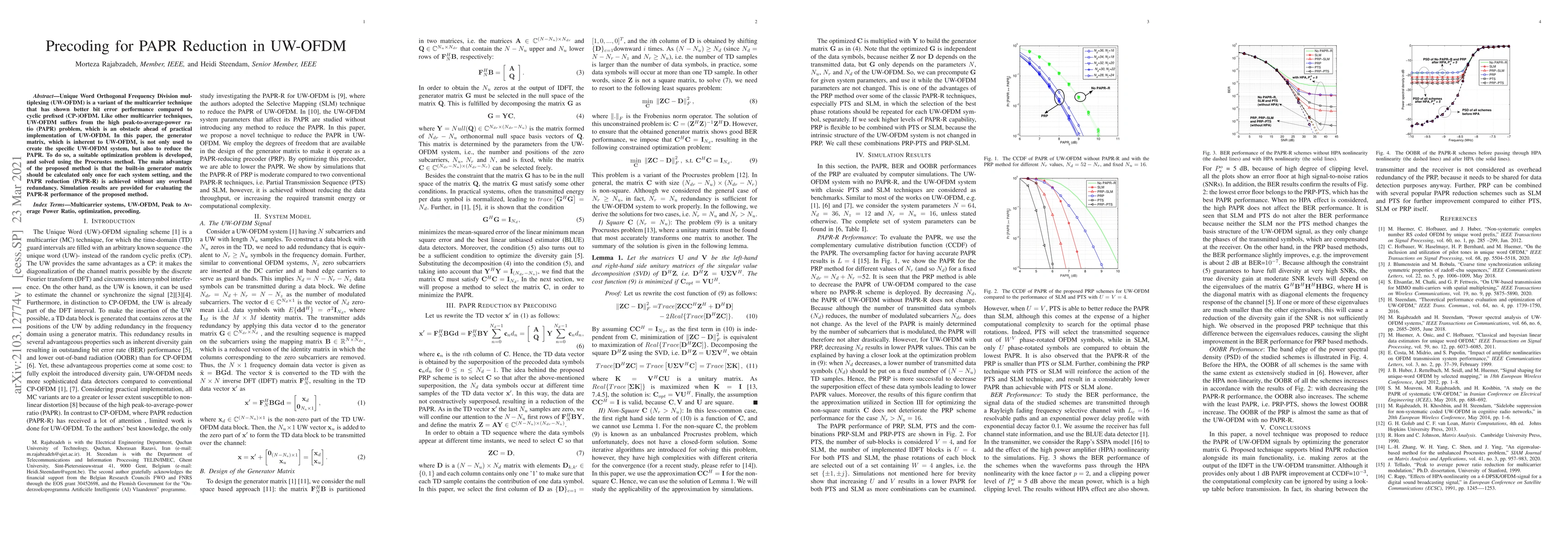 The research proposes a novel technique to reduce PAPR in UW-OFDM by optimizing the generator matrix G, utilizing the degrees of freedom available in its design as a PAPR-reducing precoder (PRP). The optimization problem is solved using the Procrustes method, ensuring the generator matrix is calculated only once for each system setting without overhead redundancy.