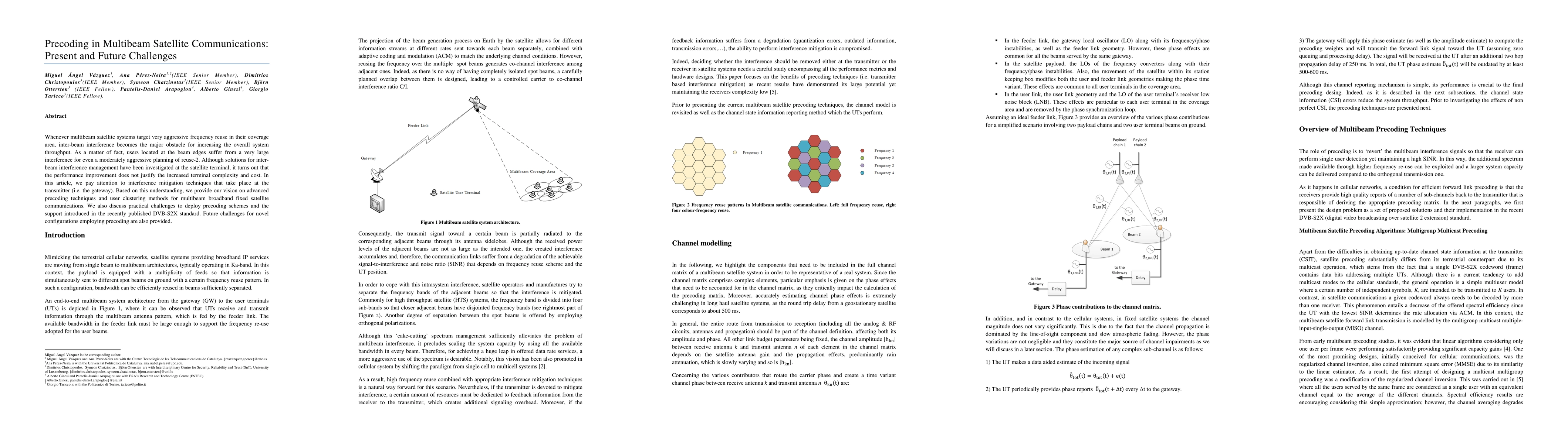 This paper explores advanced precoding techniques for mitigating inter-beam interference in multibeam satellite communications, emphasizing the importance of transmitter-based solutions over satellite terminal complexity. It discusses practical deployment challenges and future directions, including the DVB-S2X standard's support for precoding.