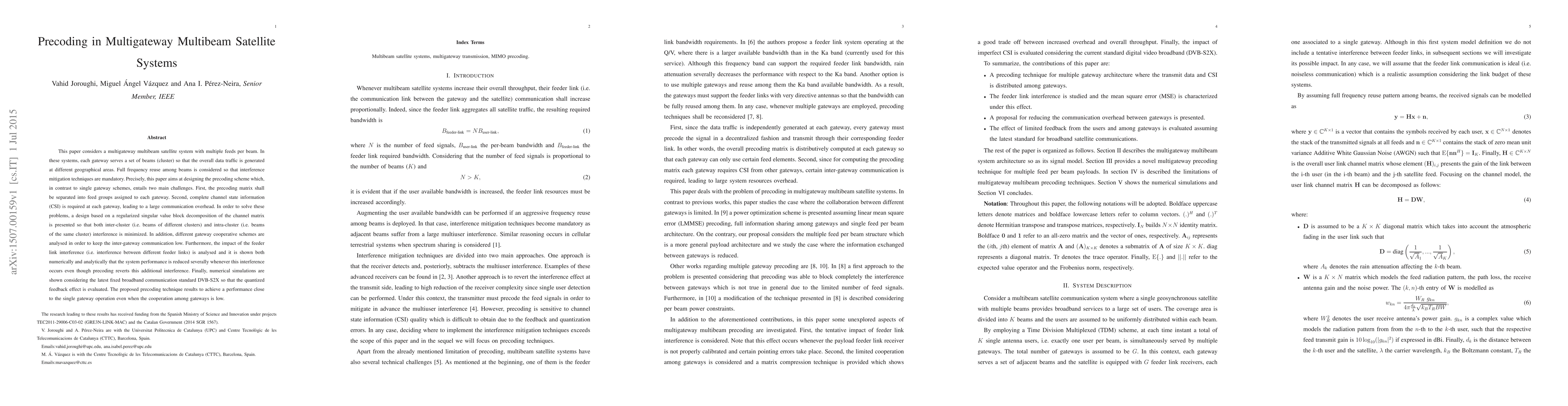 This paper explores precoding in multigateway multibeam satellite systems, addressing the challenges of inter-cluster and intra-cluster interference. It proposes a precoding scheme based on regularized singular value decomposition to minimize interference while analyzing the impact of feeder link interference and cooperative gateway schemes. Numerical simulations show the technique achieves near-single gateway performance despite low gateway cooperation.
