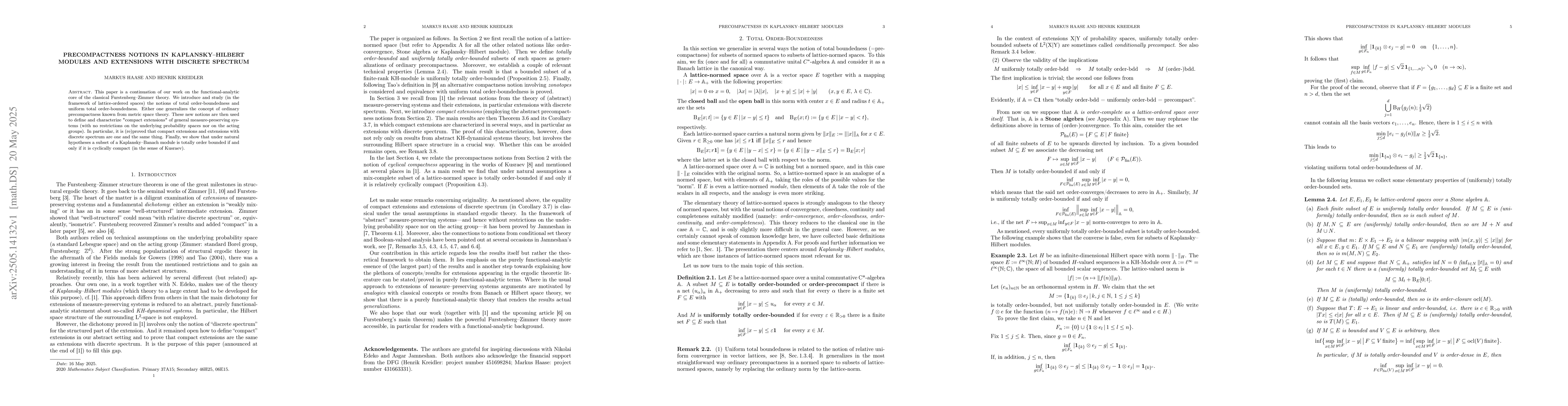 This paper is a continuation of our work on the functional-analytic core of the classical Furstenberg-Zimmer theory. We introduce and study (in the framework of lattice-ordered spaces) the notions of total order-boundedness and uniform total order-boundedness. Either one generalizes the concept of ordinary precompactness known from metric space theory. These new notions are then used to define and characterize "compact extensions" of general measure-preserving systems (with no restrictions on the underlying probability spaces nor on the acting groups). In particular, it is (re)proved that compact extensions and extensions with discrete spectrum are one and the same thing. Finally, we show that under natural hypotheses a subset of a Kaplansky-Banach module is totally order bounded if and only if it is cyclically compact (in the sense of Kusraev).