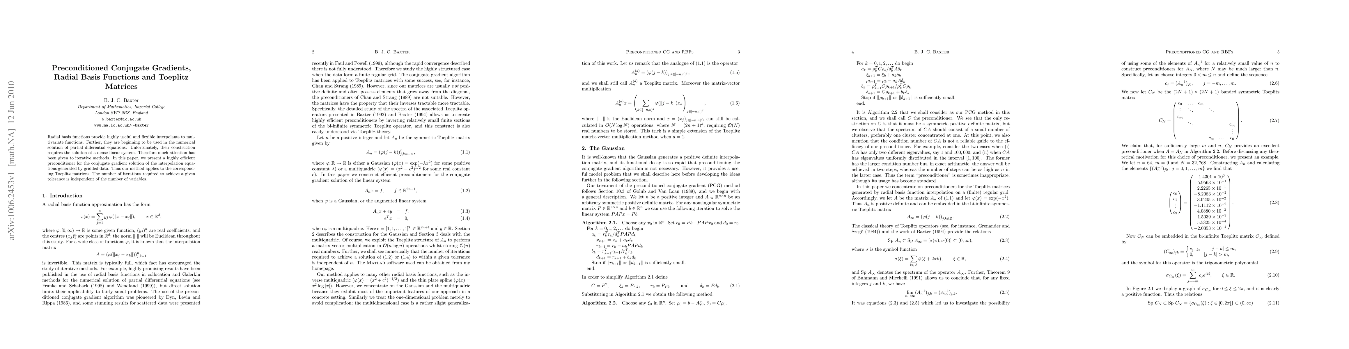 Radial basis functions provide highly useful and flexible interpolants to multivariate functions. Further, they are beginning to be used in the numerical solution of partial differential equations. Unfortunately, their construction requires the solution of a dense linear system. Therefore much attention has been given to iterative methods. In this paper, we present a highly efficient preconditioner for the conjugate gradient solution of the interpolation equations generated by gridded data. Thus our method applies to the corresponding Toeplitz matrices. The number of iterations required to achieve a given tolerance is independent of the number of variables.