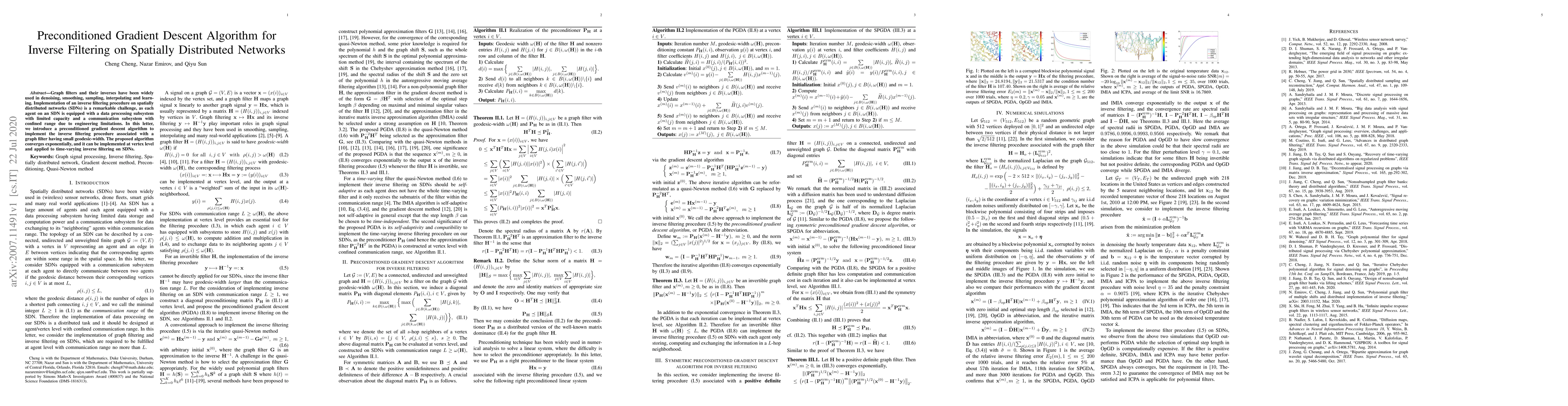 Graph filters and their inverses have been widely used in denoising, smoothing, sampling, interpolating and learning. Implementation of an inverse filtering procedure on spatially distributed networks (SDNs) is a remarkable challenge, as each agent on an SDN is equipped with a data processing subsystem with limited capacity and a communication subsystem with confined range due to engineering limitations. In this letter, we introduce a preconditioned gradient descent algorithm to implement the inverse filtering procedure associated with a graph filter having small geodesic-width. The proposed algorithm converges exponentially, and it can be implemented at vertex level and applied to time-varying inverse filtering on SDNs.