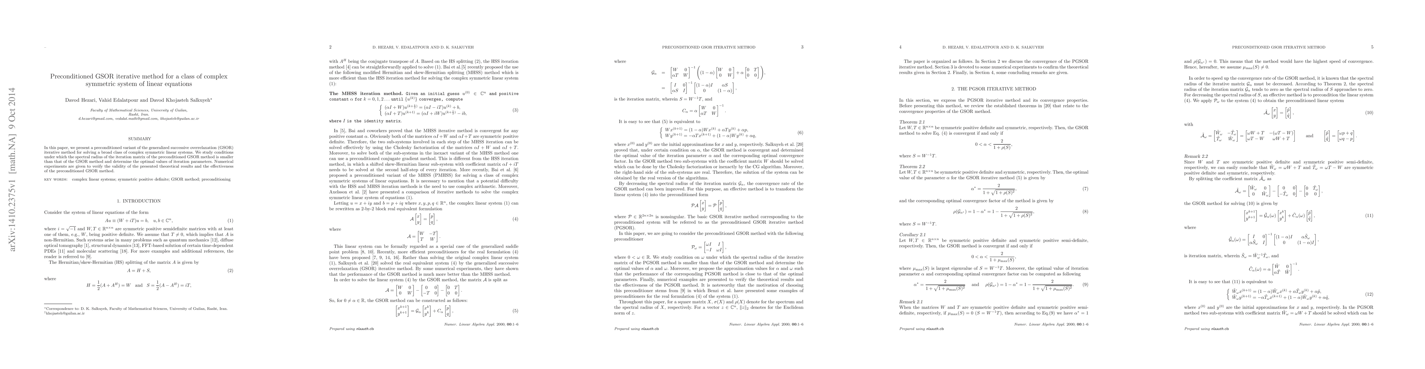 This paper introduces a preconditioned GSOR iterative method for solving complex symmetric linear systems, analyzing conditions under which its spectral radius is smaller than the standard GSOR method and determining optimal iteration parameters. Numerical experiments validate the theoretical results and demonstrate the effectiveness of the proposed method.