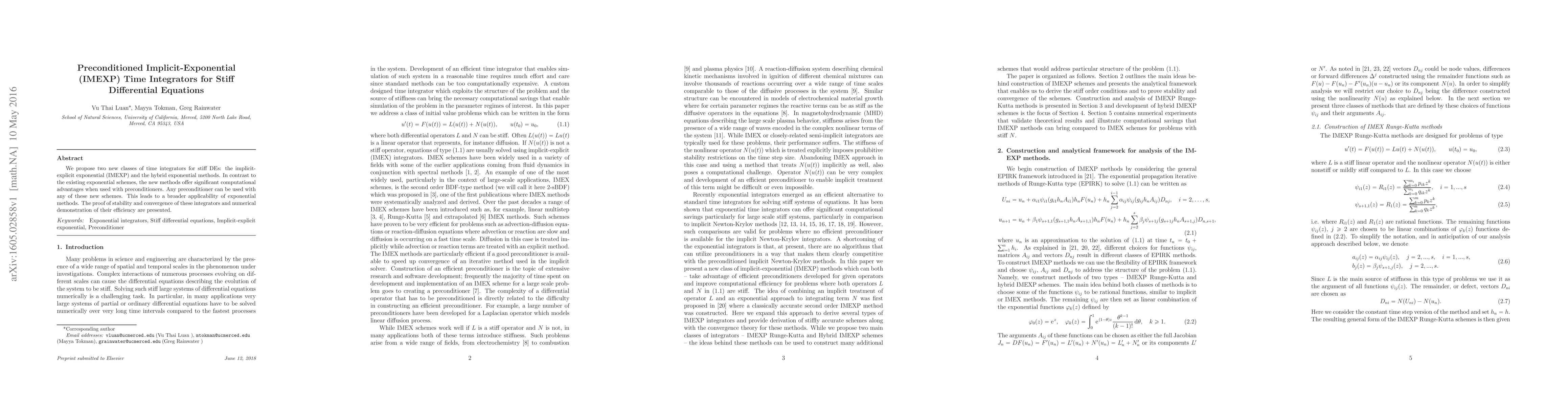 This paper introduces two new classes of time integrators—implicit-explicit exponential (IMEXP) and hybrid exponential methods—for solving stiff differential equations. These methods, when used with preconditioners, offer significant computational benefits, broadening the applicability of exponential schemes. The paper provides proofs of stability and convergence, along with numerical demonstrations of their efficiency.