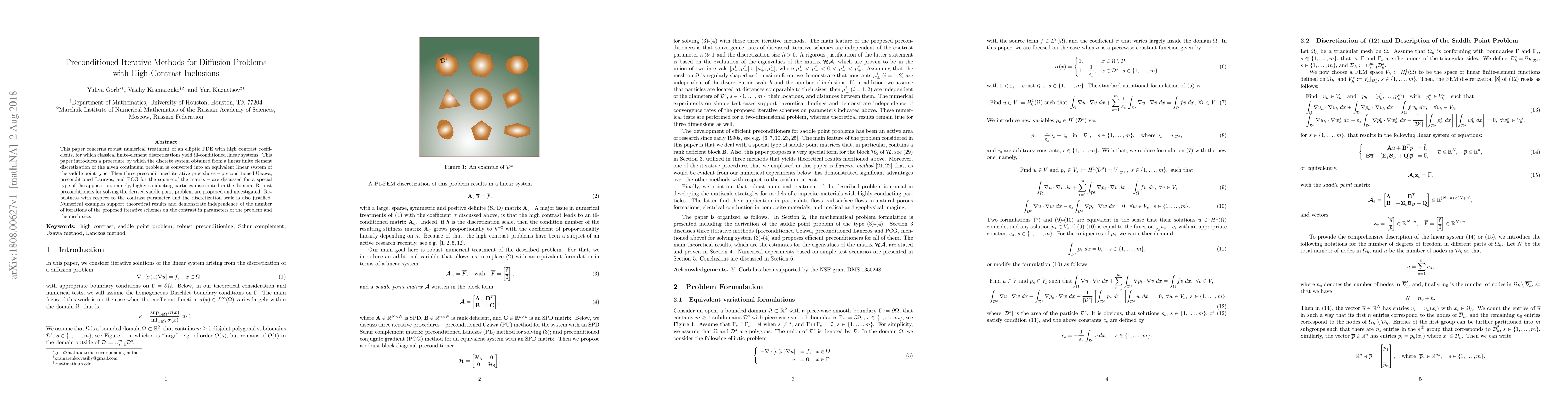 This paper concerns robust numerical treatment of an elliptic PDE with high contrast coefficients, for which classical finite-element discretizations yield ill-conditioned linear systems. This paper introduces a procedure by which the discrete system obtained from a linear finite element discretization of the given continuum problem is converted into an equivalent linear system of the saddle point type. Then three preconditioned iterative procedures -- preconditioned Uzawa, preconditioned Lanczos, and PCG for the square of the matrix -- are discussed for a special type of the application, namely, highly conducting particles distributed in the domain. Robust preconditioners for solving the derived saddle point problem are proposed and investigated. Robustness with respect to the contrast parameter and the discretization scale is also justified. Numerical examples support theoretical results and demonstrate independence of the number of iterations of the proposed iterative schemes on the contrast in parameters of the problem and the mesh size.