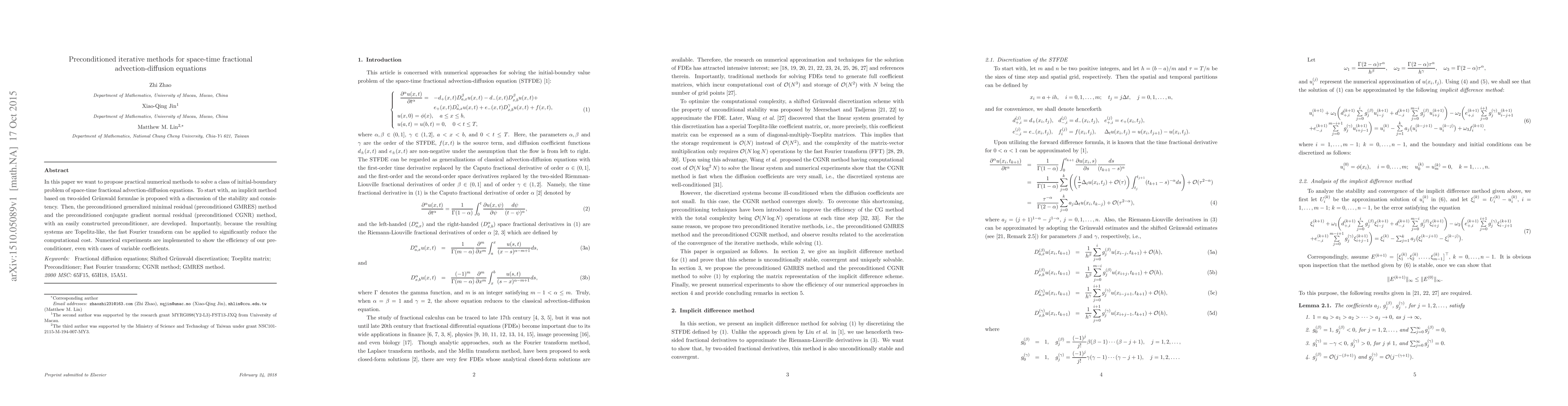 This paper proposes numerical methods for solving space-time fractional advection-diffusion equations, including an implicit method based on two-sided Grünwald formulae and preconditioned iterative methods (GMRES and CGNR). The use of the fast Fourier transform due to the Toeplitz-like nature of the resulting systems significantly reduces computational costs, as demonstrated by numerical experiments.