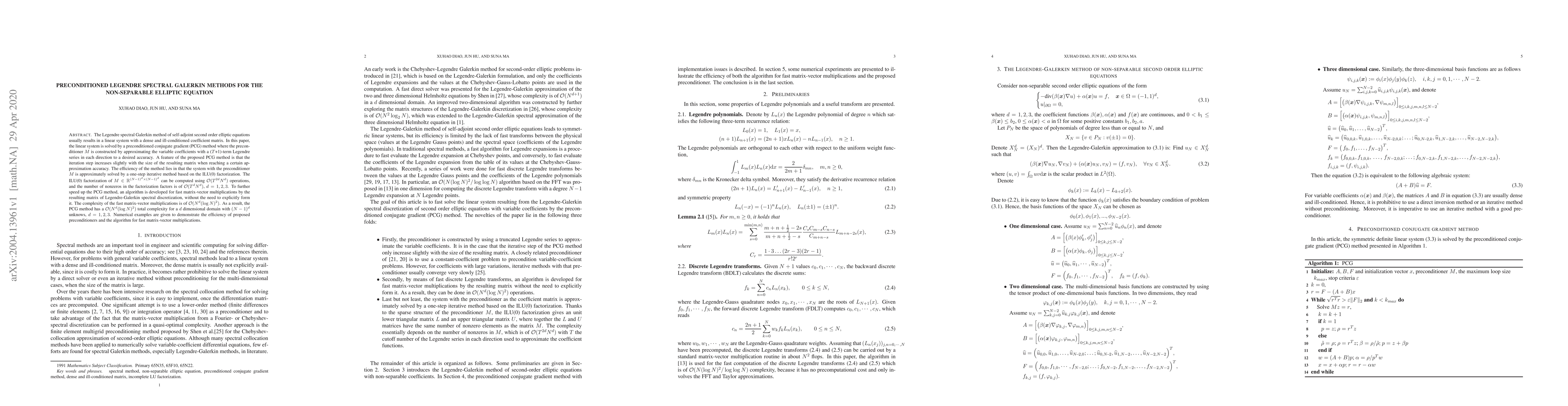 This paper proposes a preconditioned conjugate gradient method for solving non-separable elliptic equations using Legendre spectral Galerkin methods. The method employs a preconditioner that approximates variable coefficients with a Legendre series, enabling efficient iterative solutions with a complexity of $\mathcal{O}(N^d (\log N)^2)$ for $d$ dimensional domains.