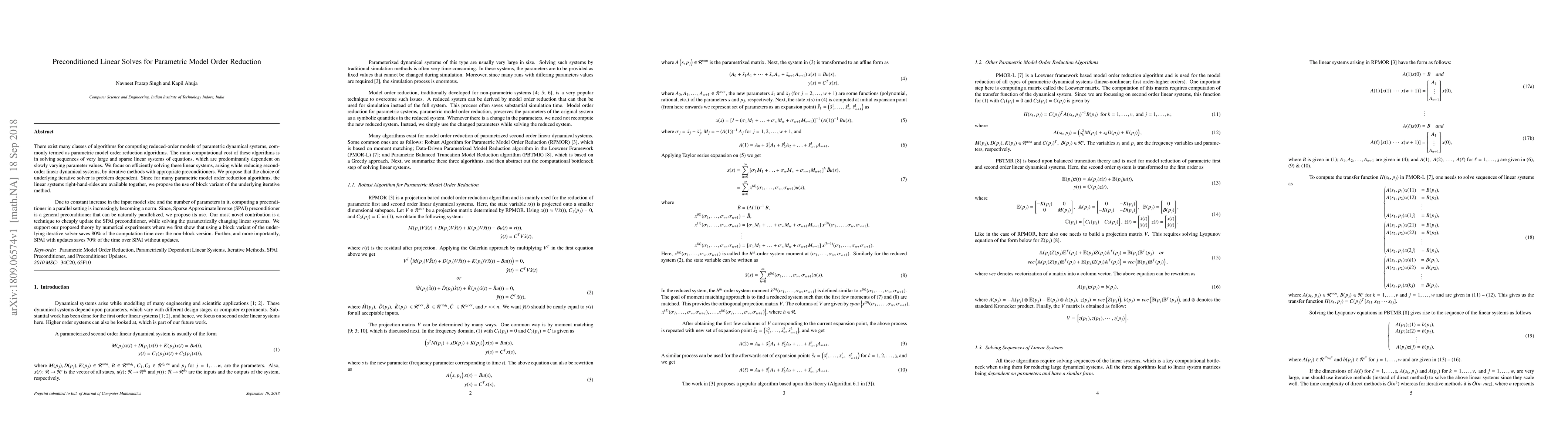 The main computational cost of algorithms for computing reduced-order models of parametric dynamical systems is in solving sequences of very large and sparse linear systems. We focus on efficiently solving these linear systems, arising while reducing second-order linear dynamical systems, by iterative methods with appropriate preconditioners. We propose that the choice of underlying iterative solver is problem dependent. We propose the use of block variant of the underlying iterative method because often all right-hand-side are available together. Since, Sparse Approximate Inverse (SPAI) preconditioner is a general preconditioner that can be naturally parallelized, we propose its use. Our most novel contribution is a technique to cheaply update the SPAI preconditioner, while solving the parametrically changing linear systems. We support our proposed theory by numerical experiments where we first show benefit of 80% in time by using a block iterative method, and a benefit of 70% in time by using SPAI updates.