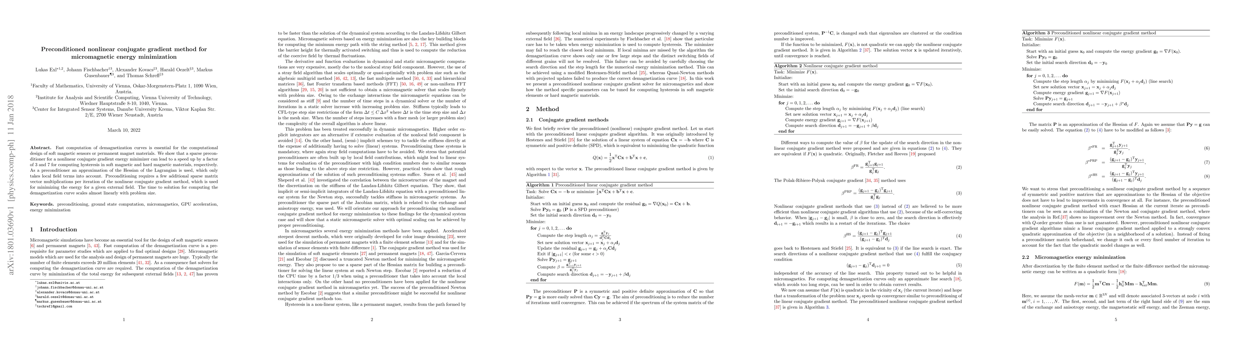This paper proposes a preconditioned nonlinear conjugate gradient method for micromagnetic energy minimization, achieving a speedup of up to 7 times for computing hysteresis in magnetic materials. The method uses a sparse preconditioner based on an approximation of the Hessian, significantly reducing computation time for demagnetization curves.