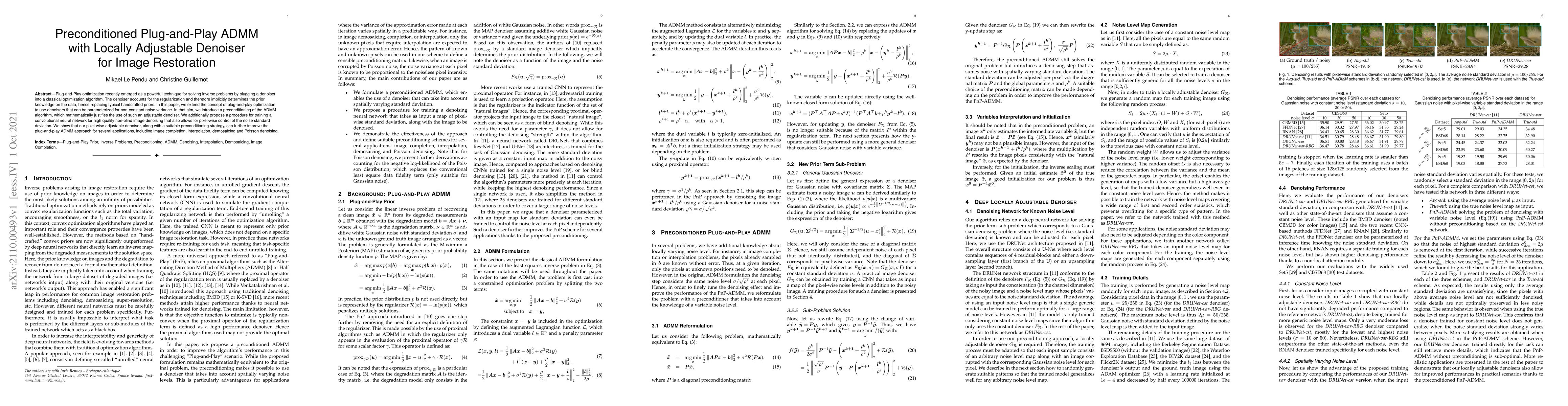 This paper introduces a preconditioned Plug-and-Play ADMM method that uses a locally adjustable denoiser for image restoration, improving classical optimization techniques by incorporating adaptive noise variance. The proposed method enhances image restoration tasks like completion, interpolation, demosaicing, and Poisson denoising.
