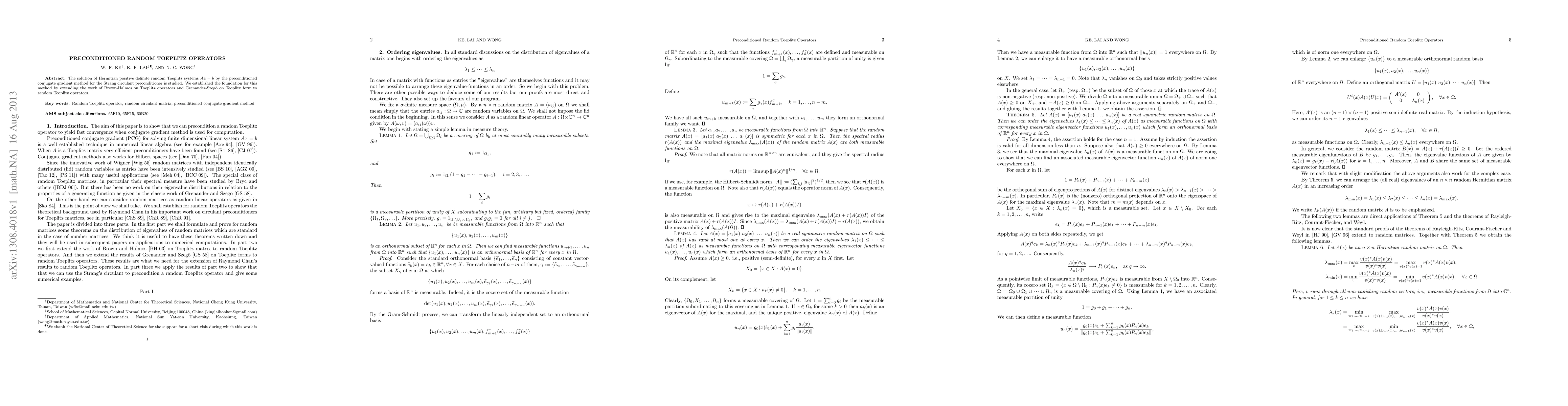 The solution of Hermitian positive definite random Toeplitz systems $Ax=b$ by the preconditioned conjugate gradient method for the Strang circulant preconditioner is studied. We established the foundation for this method by extending the work of Brown-Halmos on Toeplitz operators and Grenander-Szeg\"o on Teoplitz form to random Teoplitz operators.