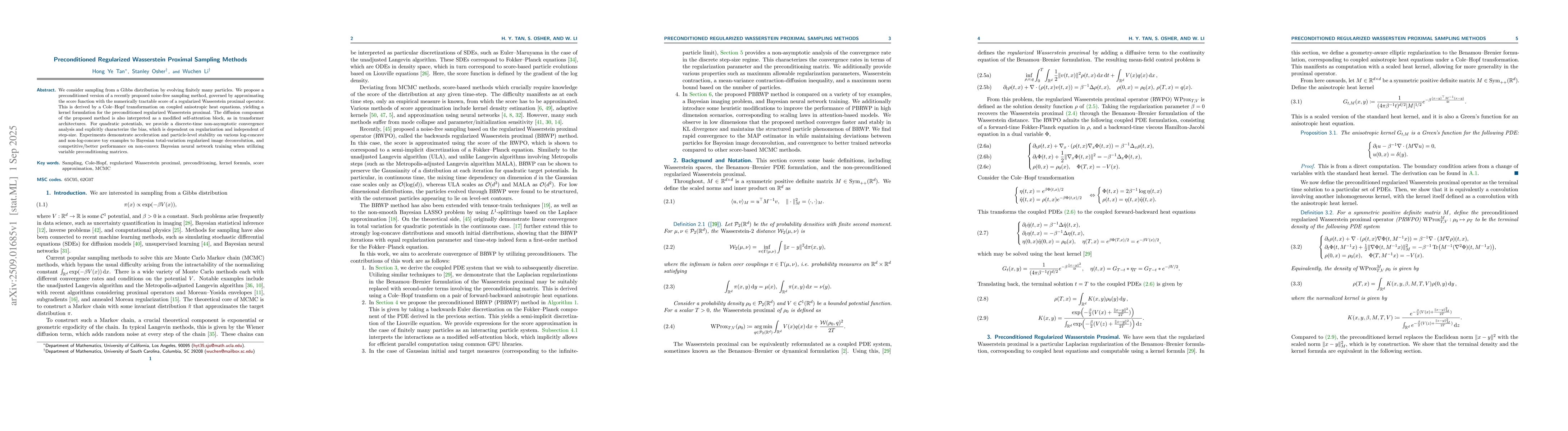 We consider sampling from a Gibbs distribution by evolving finitely many particles. We propose a preconditioned version of a recently proposed noise-free sampling method, governed by approximating the score function with the numerically tractable score of a regularized Wasserstein proximal operator. This is derived by a Cole--Hopf transformation on coupled anisotropic heat equations, yielding a kernel formulation for the preconditioned regularized Wasserstein proximal. The diffusion component of the proposed method is also interpreted as a modified self-attention block, as in transformer architectures. For quadratic potentials, we provide a discrete-time non-asymptotic convergence analysis and explicitly characterize the bias, which is dependent on regularization and independent of step-size. Experiments demonstrate acceleration and particle-level stability on various log-concave and non-log-concave toy examples to Bayesian total-variation regularized image deconvolution, and competitive/better performance on non-convex Bayesian neural network training when utilizing variable preconditioning matrices.