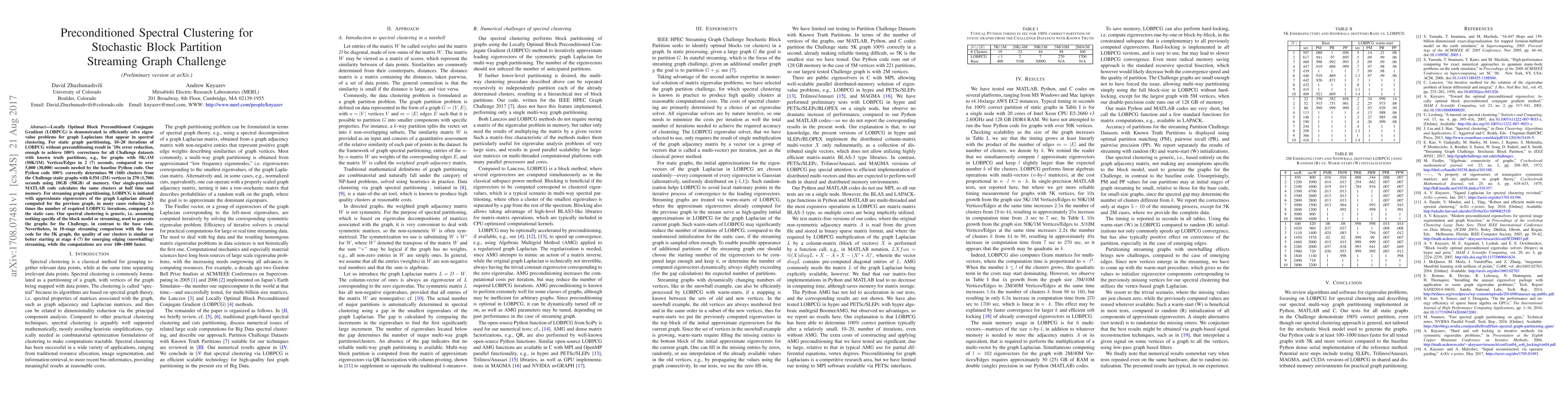 This paper presents a preconditioned spectral clustering method using LOBPCG to efficiently partition static and streaming graphs. The method achieves 100% correctness for static graphs and significantly outperforms the baseline in computation time and memory usage. For streaming graphs, LOBPCG reduces the number of iterations needed and maintains cluster quality while being over 100-1000 times faster.