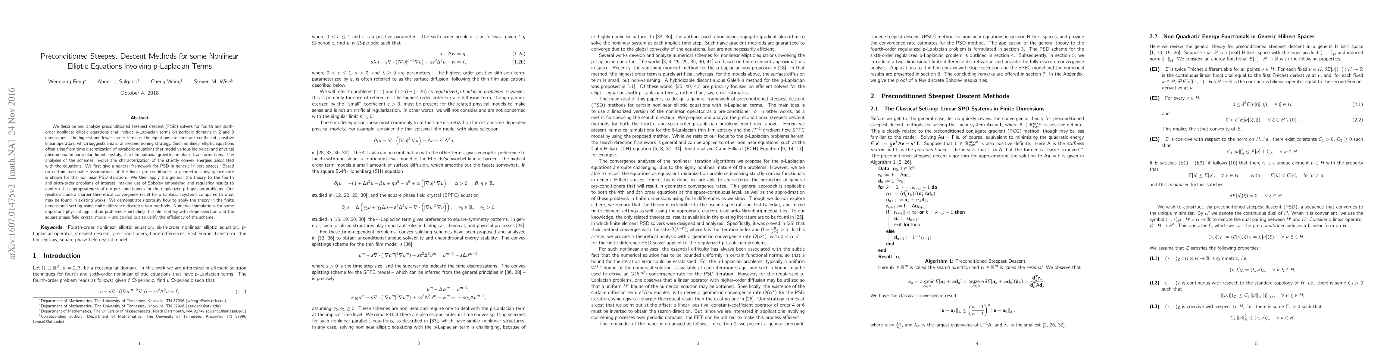 Researchers developed preconditioned steepest descent methods for solving nonlinear elliptic equations with p-Laplacian terms, achieving a sharper theoretical convergence result and demonstrating their efficiency in numerical simulations of physical application problems.