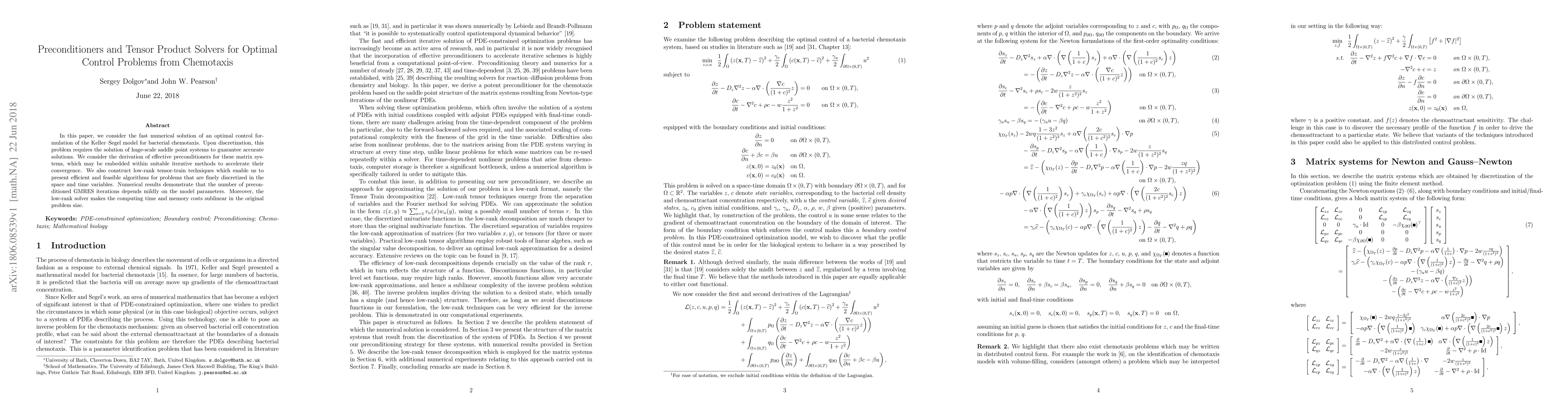 This paper presents preconditioners and tensor product solvers to efficiently solve large-scale saddle point systems arising from optimal control formulations of the Keller-Segel model for bacterial chemotaxis, achieving sublinear computing time and memory costs.