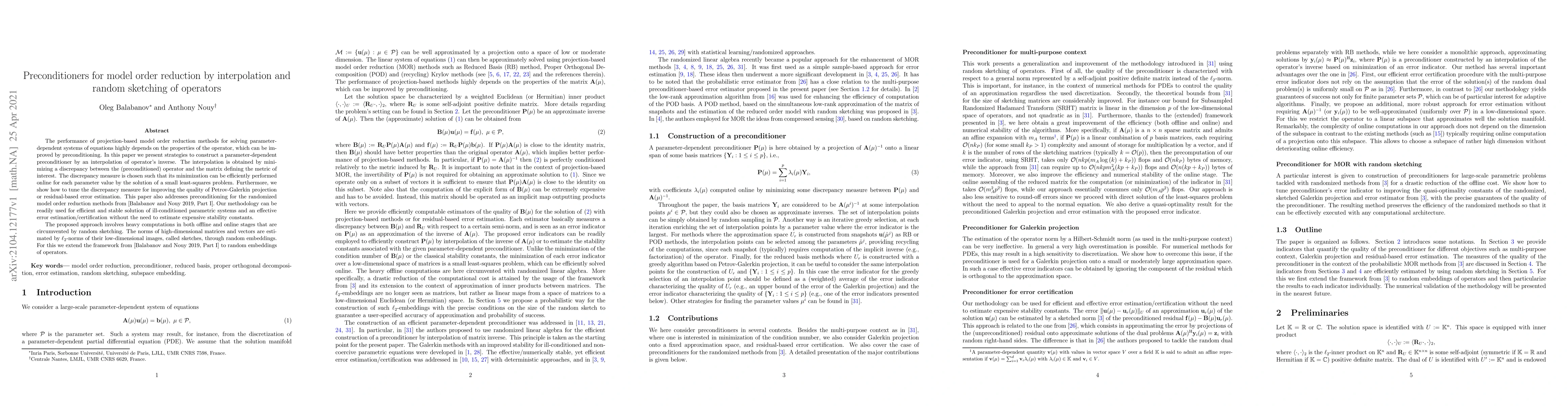 The performance of projection-based model order reduction methods for solving parameter-dependent systems of equations highly depends on the properties of the operator, which can be improved by preconditioning. In this paper we present strategies to construct a parameter-dependent preconditioner by an interpolation of operator's inverse. The interpolation is obtained by minimizing a discrepancy between the (preconditioned) operator and the matrix defining the metric of interest. The discrepancy measure is chosen such that its minimization can be efficiently performed online for each parameter value by the solution of a small least-squares problem. Furthermore, we show how to tune the discrepancy measure for improving the quality of Petrov-Galerkin projection or residual-based error estimation. This paper also addresses preconditioning for the randomized model order reduction methods from [Balabanov and Nouy 2019, Part I]. Our methodology can be readily used for efficient and stable solution of ill-conditioned parametric systems and an effective error estimation/certification without the need to estimate expensive stability constants. The proposed approach involves heavy computations in both offline and online stages that are circumvented by random sketching. The norms of high-dimensional matrices and vectors are estimated by l2-norms of their low-dimensional images, called sketches, through random embeddings. For this we extend the framework from [Balabanov and Nouy 2019, Part I] to random embeddings of operators.
