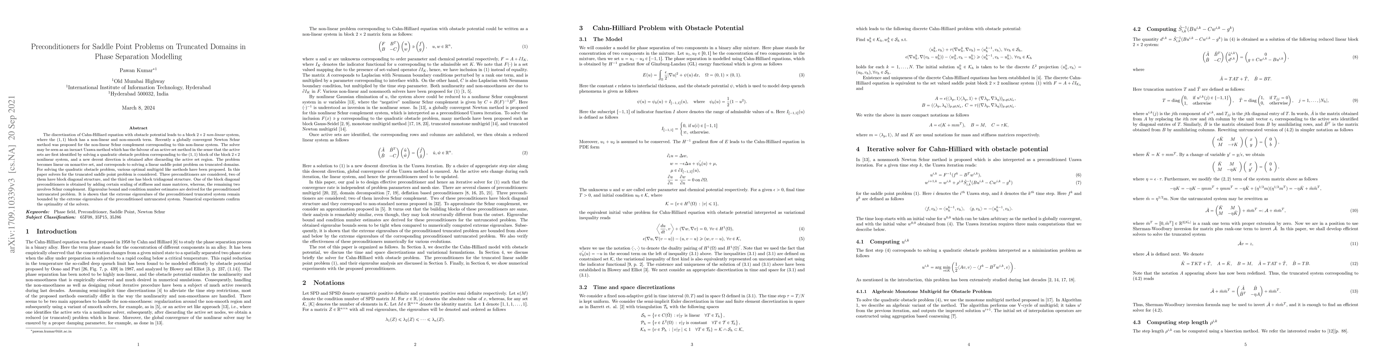 The discretization of Cahn-Hilliard equation with obstacle potential leads to a block 2 by 2 non-linear system, where the p1, 1q block has a non-linear and non-smooth term. Recently a globally convergent Newton Schur method was proposed for the non-linear Schur complement corresponding to this non-linear system. The solver may be seen as an inexact Uzawa method which has the falvour of an active set method in the sense that the active sets are first identified by solving a quadratic obstacle problem corresponding to the p1, 1q block of the block 2 by 2 nonlinear system, and a new decent direction is obtained after discarding the active set region. The problem becomes linear on nonactive set, and corresponds to solving a linear saddle point problem on truncated domains. For solving the quadratic obstacle problem, various optimal multigrid like methods have been proposed. In this paper solvers for the truncated saddle point problem is considered. Three preconditioners are considered, two of them have block diagonal structure, and the third one has block tridiagonal structure. One of the block diagonal preconditioners is obtained by adding certain scaling of stiffness and mass matrices, whereas, the remaining two involves Schur complement. Eigenvalue bound and condition number estimates are derived for the preconditioned untruncated problem. It is shown that the extreme eigenvalues of the preconditioned truncated system remain bounded by the extreme eigenvalues of the preconditioned untruncated system. Numerical experiments confirm the optimality of the solvers.