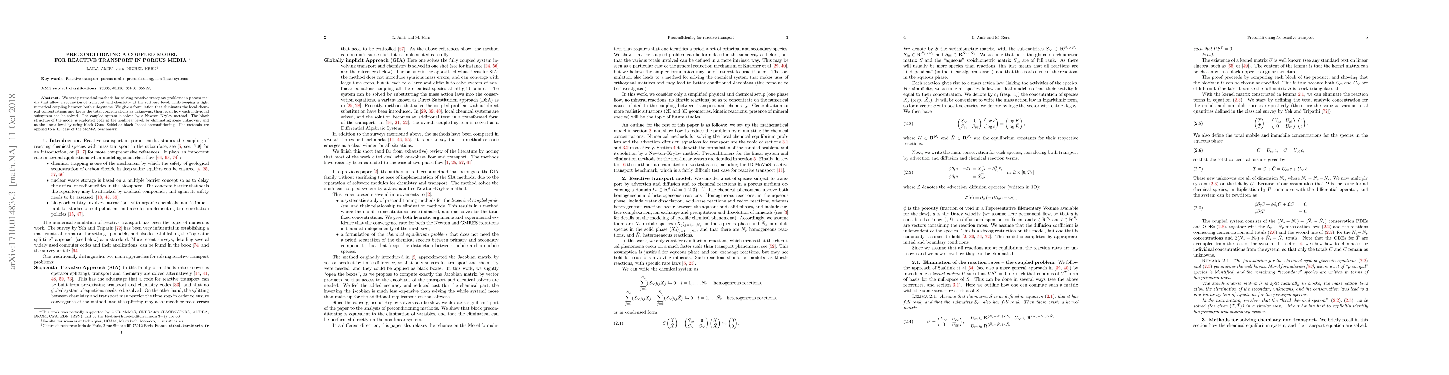 This paper proposes numerical methods for solving reactive transport problems in porous media, focusing on separating transport and chemistry while maintaining a tightly coupled model. It introduces preconditioning techniques to improve computational efficiency and applies these methods to a simplified 1D MoMaS benchmark.