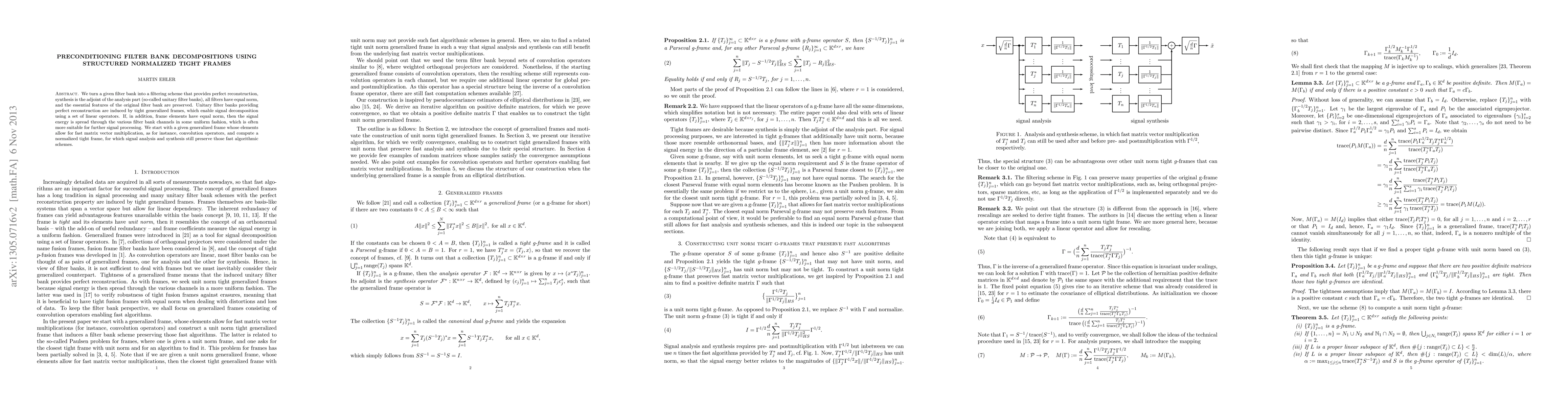 This paper develops a method to precondition filter banks into structured normalized tight frames, ensuring perfect reconstruction, equal norm filters, and preservation of essential features, while maintaining efficient matrix-vector operations for fast convolution. The approach leverages tight generalized frames for optimal signal decomposition.