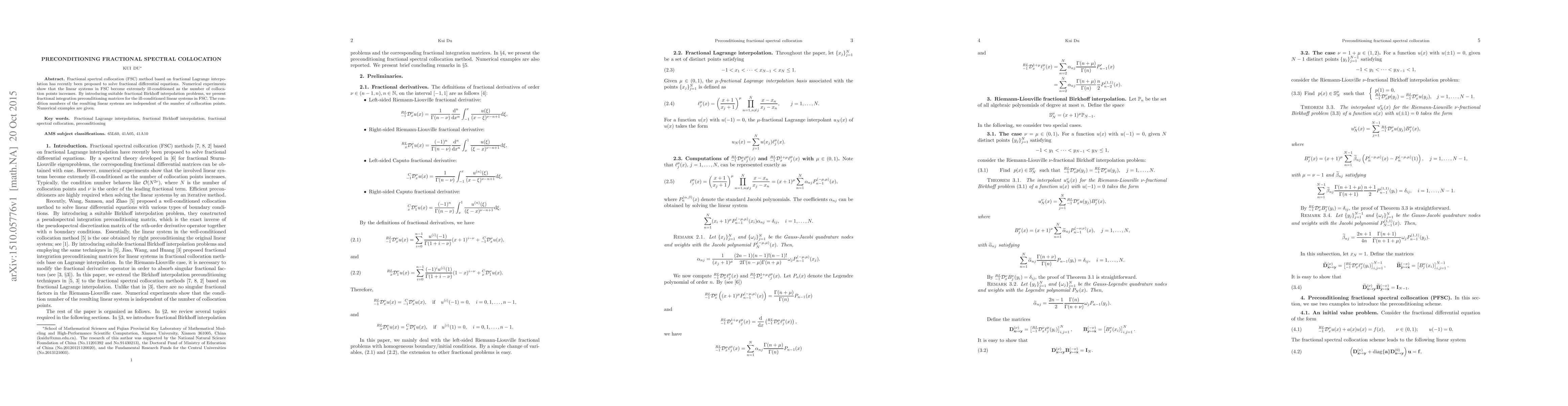 This paper proposes a preconditioning technique to address the ill-conditioning issue in fractional spectral collocation (FSC) methods, using fractional Birkhoff interpolation to create preconditioning matrices that stabilize linear systems. The resulting condition numbers remain constant regardless of the number of collocation points, as demonstrated by numerical examples.