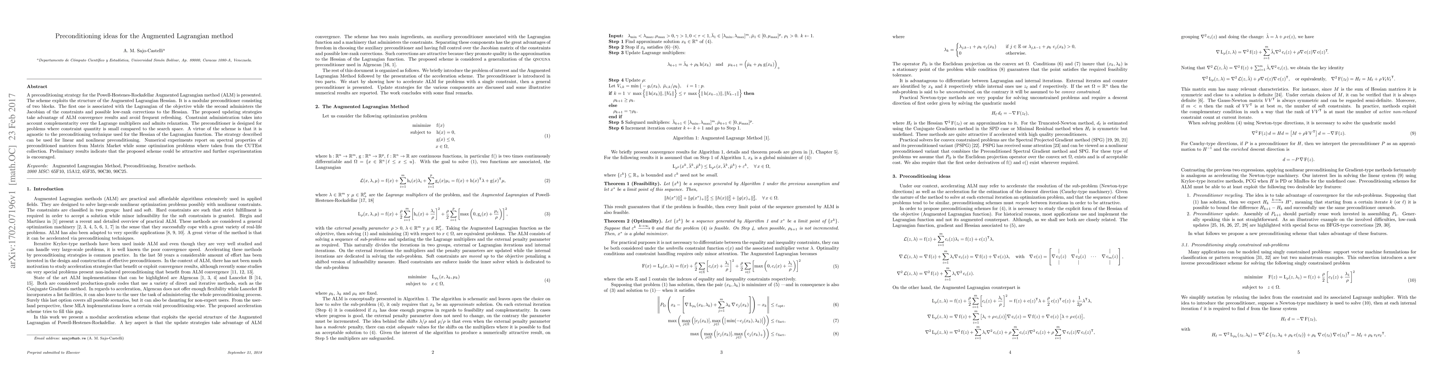 A preconditioning strategy for the Powell-Hestenes-Rockafellar Augmented Lagrangian method (ALM) is presented. The scheme exploits the structure of the Augmented Lagrangian Hessian. It is a modular preconditioner consisting of two blocks. The first one is associated with the Lagrangian of the objective while the second administers the Jacobian of the constraints and possible low-rank corrections to the Hessian. The proposed updating strategies take advantage of ALM convergence results and avoid frequent refreshing. Constraint administration takes into account complementarity over the Lagrange multipliers and admits relaxation. The preconditioner is designed for problems where constraint quantity is small compared to the search space. A virtue of the scheme is that it is agnostic to the preconditioning technique used for the Hessian of the Lagrangian function. The strategy described can be used for linear and nonlinear preconditioning. Numerical experiments report on spectral properties of preconditioned matrices from Matrix Market while some optimization problems where taken from the CUTEst collection. Preliminary results indicate that the proposed scheme could be attractive and further experimentation is encouraged.