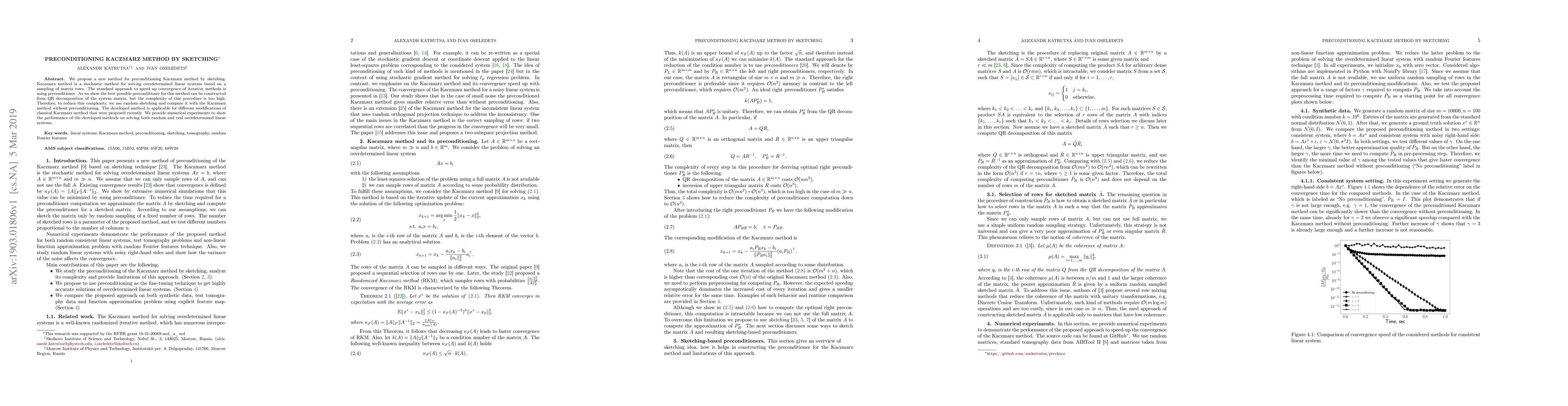 A new method for preconditioning the Kaczmarz algorithm, a stochastic method for solving overdetermined linear systems, is proposed using random sketching, offering a more efficient alternative to QR decomposition-based methods.