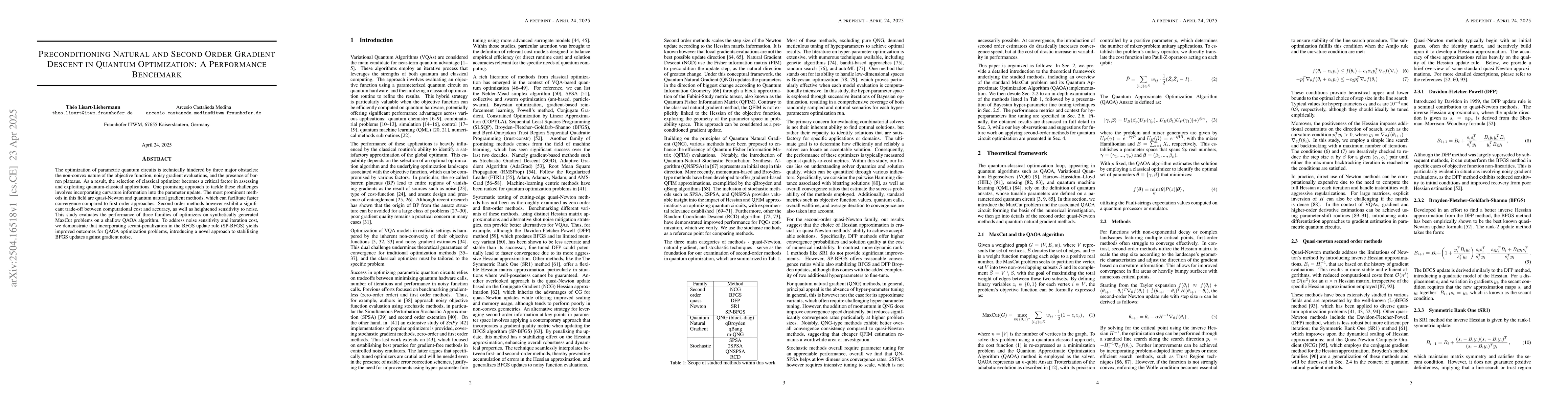 The optimization of parametric quantum circuits is technically hindered by three major obstacles: the non-convex nature of the objective function, noisy gradient evaluations, and the presence of barren plateaus. As a result, the selection of classical optimizer becomes a critical factor in assessing and exploiting quantum-classical applications. One promising approach to tackle these challenges involves incorporating curvature information into the parameter update. The most prominent methods in this field are quasi-Newton and quantum natural gradient methods, which can facilitate faster convergence compared to first-order approaches. Second order methods however exhibit a significant trade-off between computational cost and accuracy, as well as heightened sensitivity to noise. This study evaluates the performance of three families of optimizers on synthetically generated MaxCut problems on a shallow QAOA algorithm. To address noise sensitivity and iteration cost, we demonstrate that incorporating secant-penalization in the BFGS update rule (SP-BFGS) yields improved outcomes for QAOA optimization problems, introducing a novel approach to stabilizing BFGS updates against gradient noise.
