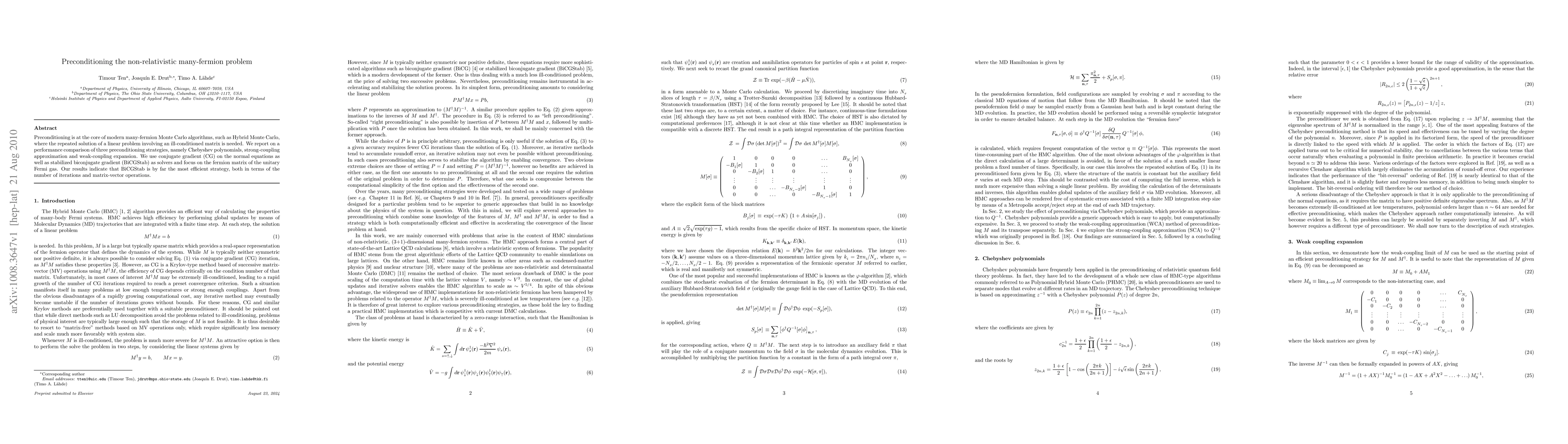 Preconditioning is at the core of modern many-fermion Monte Carlo algorithms, such as Hybrid Monte Carlo, where the repeated solution of a linear problem involving an ill-conditioned matrix is needed. We report on a performance comparison of three preconditioning strategies, namely Chebyshev polynomials, strong-coupling approximation and weak-coupling expansion. We use conjugate gradient (CG) on the normal equations as well as stabilized biconjugate gradient (BiCGStab) as solvers and focus on the fermion matrix of the unitary Fermi gas. Our results indicate that BiCGStab is by far the most efficient strategy, both in terms of the number of iterations and matrix-vector operations.