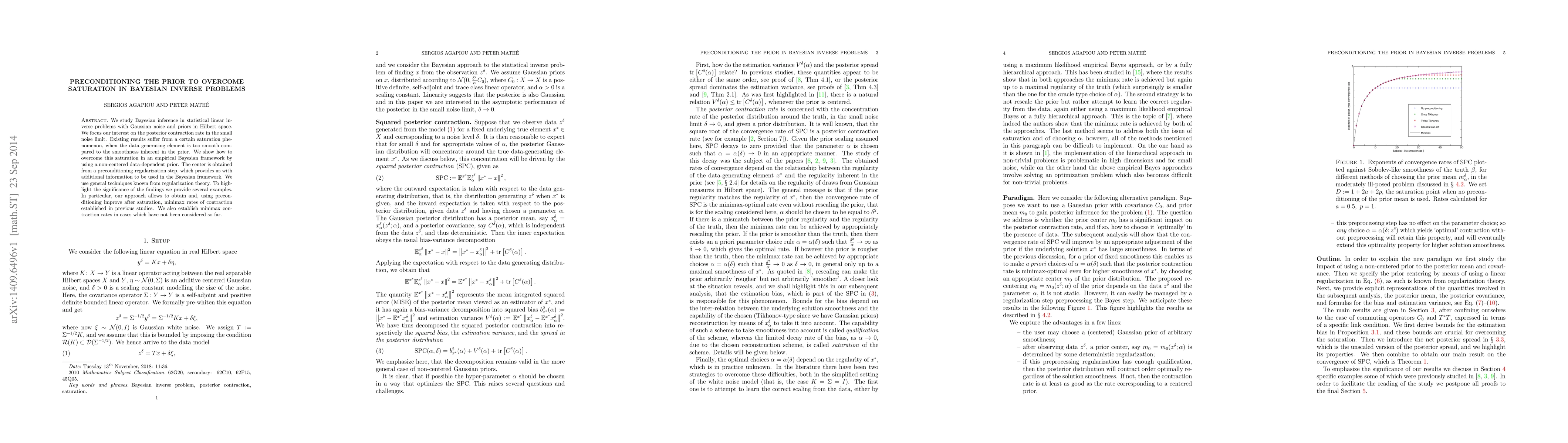 We study Bayesian inference in statistical linear inverse problems with Gaussian noise and priors in Hilbert space. We focus our interest on the posterior contraction rate in the small noise limit. Existing results suffer from a certain saturation phenomenon, when the data generating element is too smooth compared to the smoothness inherent in the prior. We show how to overcome this saturation in an empirical Bayesian framework by using a non-centered data-dependent prior. The center is obtained from a preconditioning regularization step, which provides us with additional information to be used in the Bayesian framework. We use general techniques known from regularization theory. To highlight the significance of the findings we provide several examples. In particular, our approach allows to obtain and, using preconditioning improve after saturation, minimax rates of contraction established in previous studies. We also establish minimax contraction rates in cases which have not been considered so far.