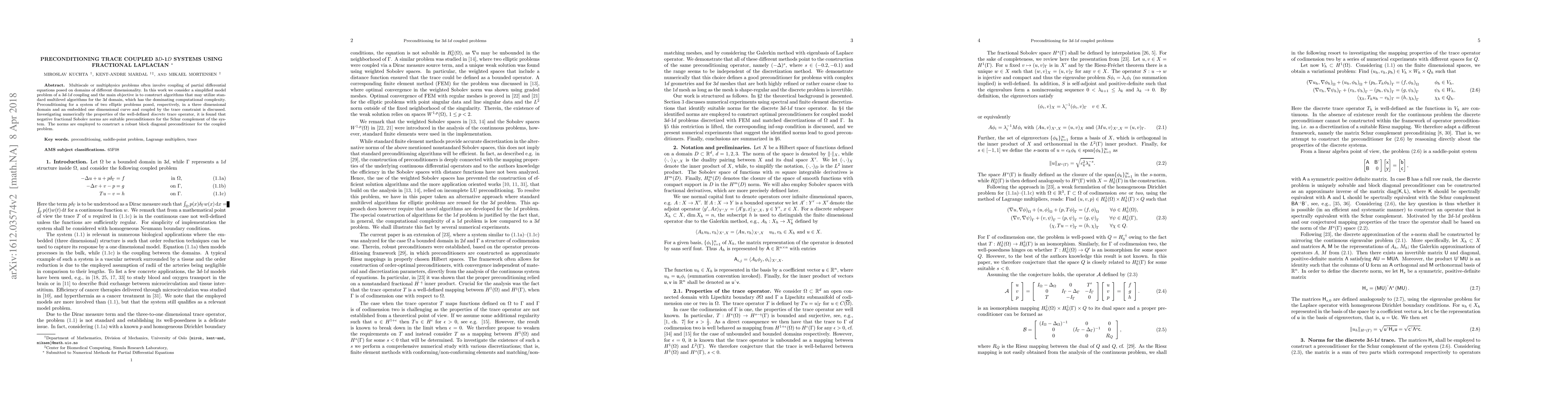 Multiscale or multiphysics problems often involve coupling of partial differential equations posed on domains of different dimensionality. In this work we consider a simplified model problem of a 3d-1d coupling and the main objective is to construct algorithms that may utilize stan- dard multilevel algorithms for the 3d domain, which has the dominating computational complexity. Preconditioning for a system of two elliptic problems posed, respectively, in a three dimensional domain and an embedded one dimensional curve and coupled by the trace constraint is discussed. Investigating numerically the properties of the well-defined discrete trace operator, it is found that negative fractional Sobolev norms are suitable preconditioners for the Schur complement of the sys- tem. The norms are employed to construct a robust block diagonal preconditioner for the coupled problem.