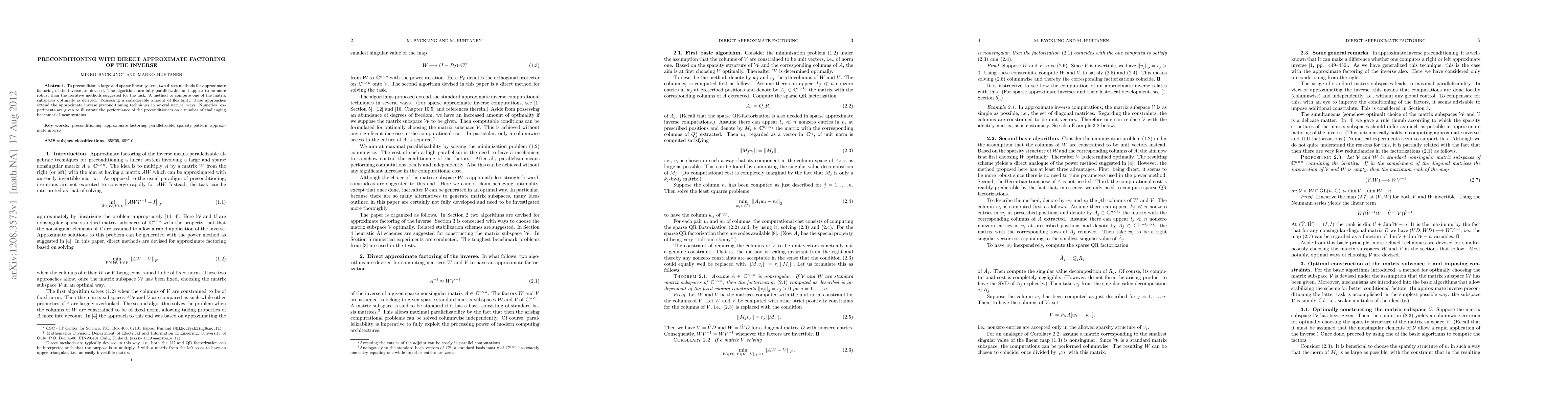 To precondition a large and sparse linear system, two direct methods for approximate factoring of the inverse are devised. The algorithms are fully parallelizable and appear to be more robust than the iterative methods suggested for the task. A method to compute one of the matrix subspaces optimally is derived. Possessing a considerable amount of flexibility, these approaches extend the approximate inverse preconditioning techniques in several natural ways. Numerical experiments are given to illustrate the performance of the preconditioners on a number of challenging benchmark linear systems.