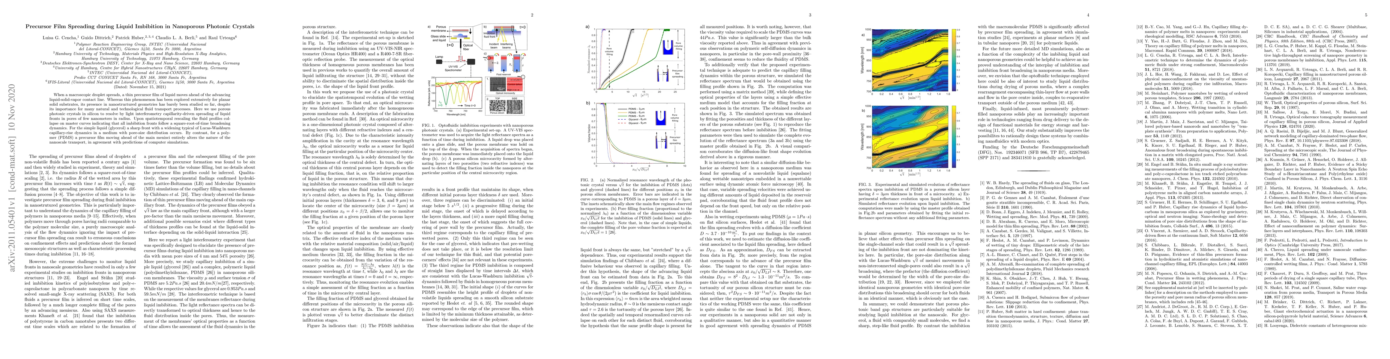 This study investigates the spreading of a precursor film in nanoporous photonic crystals using light interferometry, revealing that imbibition fronts follow a square-root-of-time dynamics. For glycerol, the imbibition exhibits typical capillary-rise behavior, while for PDMS, a precursor film alters nanoscale transport dynamics, aligning with simulation predictions.