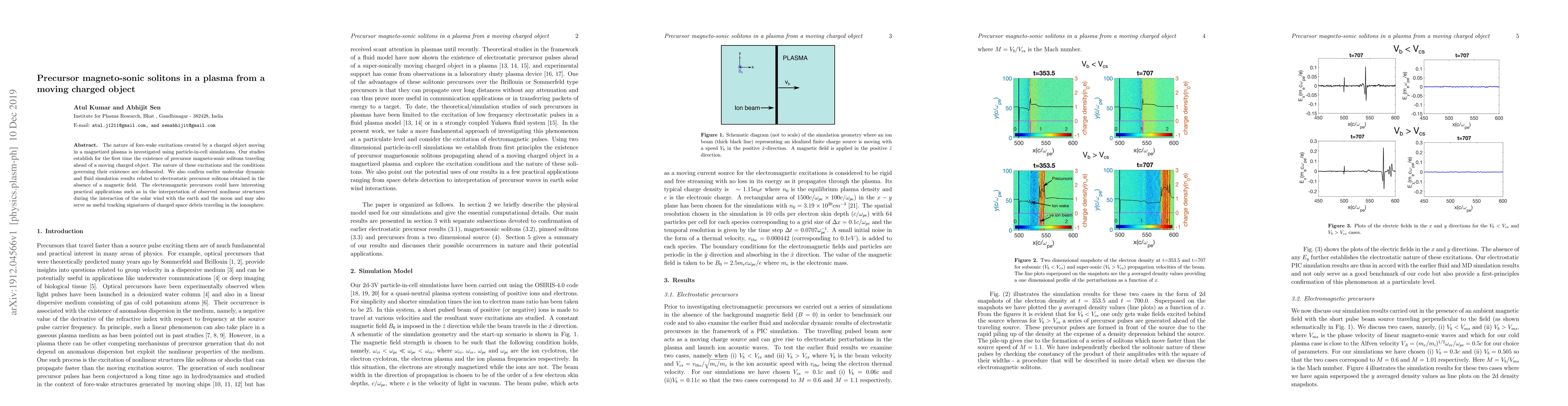 This paper investigates the fore-wake excitations generated by a charged object moving through a magnetized plasma, revealing the existence of precursor magneto-sonic solitons via particle-in-cell simulations. These findings may have practical applications in understanding nonlinear structures in space interactions and tracking charged space debris.