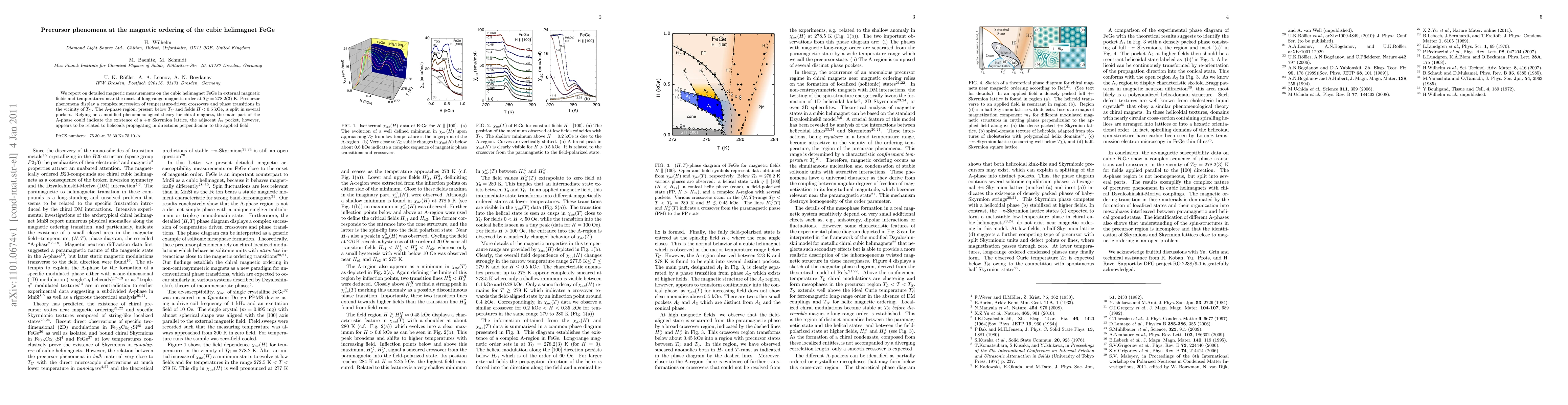 Researchers studied the magnetic ordering of FeGe in external fields and temperatures near its critical temperature, finding complex precursor phenomena including Skyrmion lattices and helicoid structures.