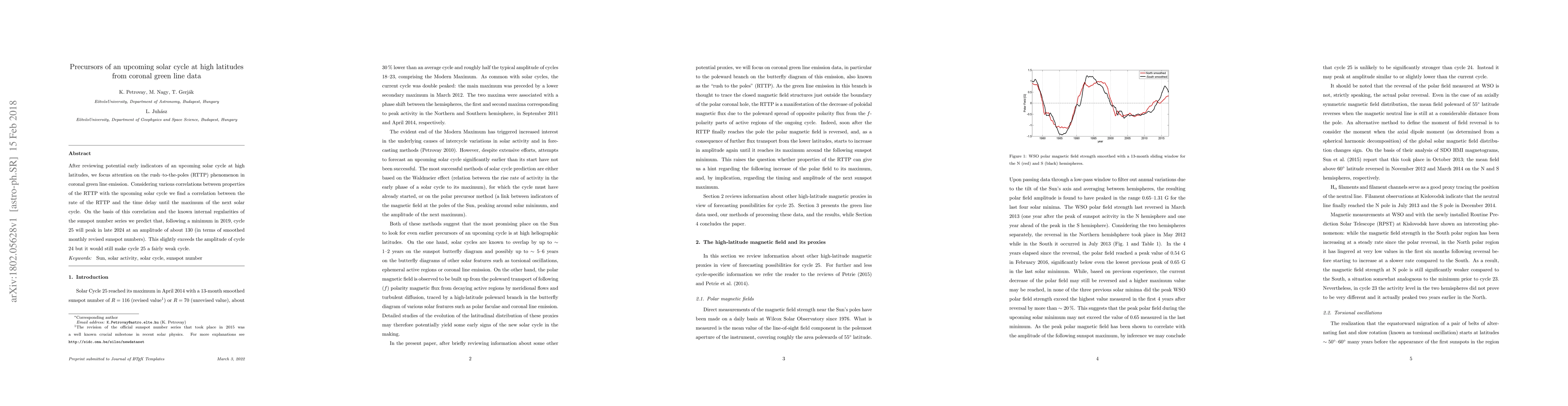 Researchers found a correlation between the rate of coronal green line emission's rush-to-the-poles phenomenon and the time delay until a solar cycle peaks, predicting cycle 25 will peak in late 2024 with an amplitude of around 130.
