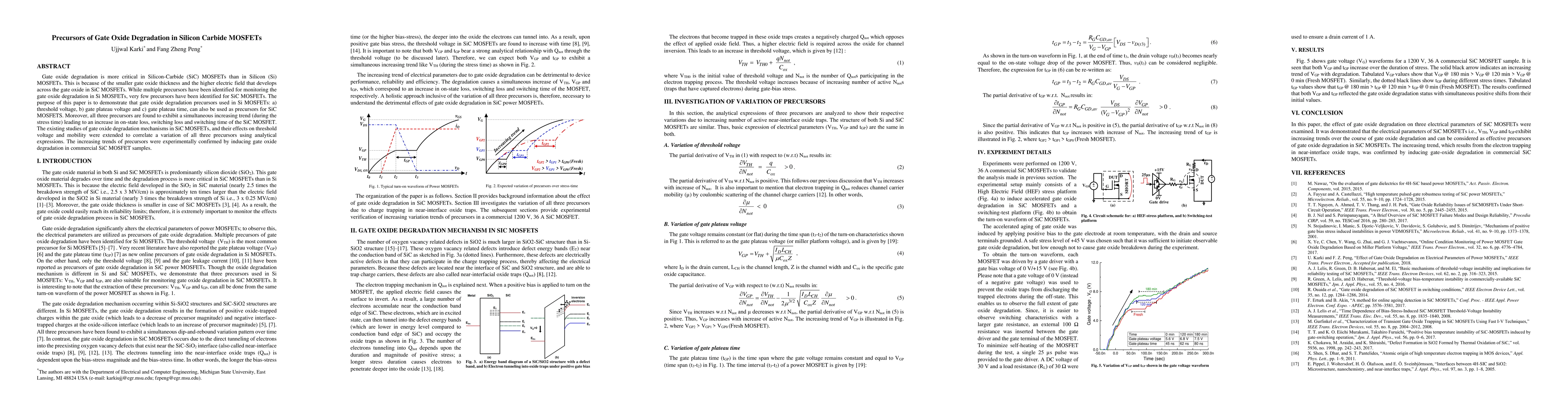 This paper identifies that the same precursors used for monitoring gate oxide degradation in Si MOSFETs—threshold voltage, gate plateau voltage, and gate plateau time—can also be applied to SiC MOSFETs. Experimental results confirm that these precursors simultaneously increase during stress, leading to higher on-state and switching losses in SiC MOSFETs, thus providing valuable insights for degradation monitoring.