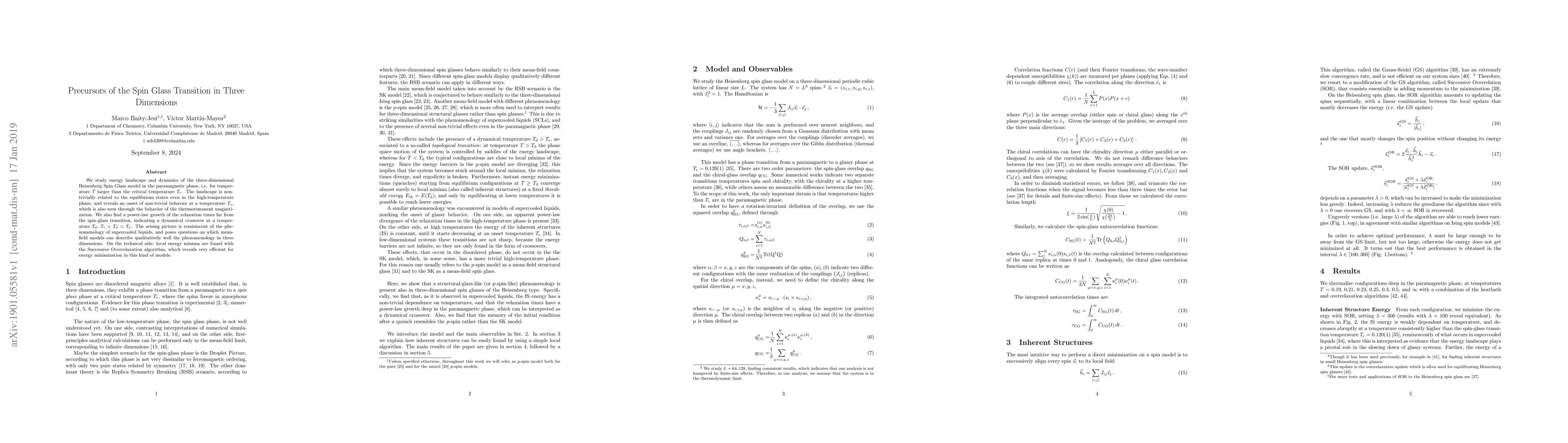 This paper investigates the energy landscape and dynamics of the three-dimensional Heisenberg Spin Glass model above its critical temperature, revealing a dynamical crossover and non-trivial behavior onset at temperatures $T_\mathrm{d}$ and $T_\mathrm{o}$ respectively. The findings suggest a phenomenology similar to supercooled liquids and challenge mean-field models' applicability.