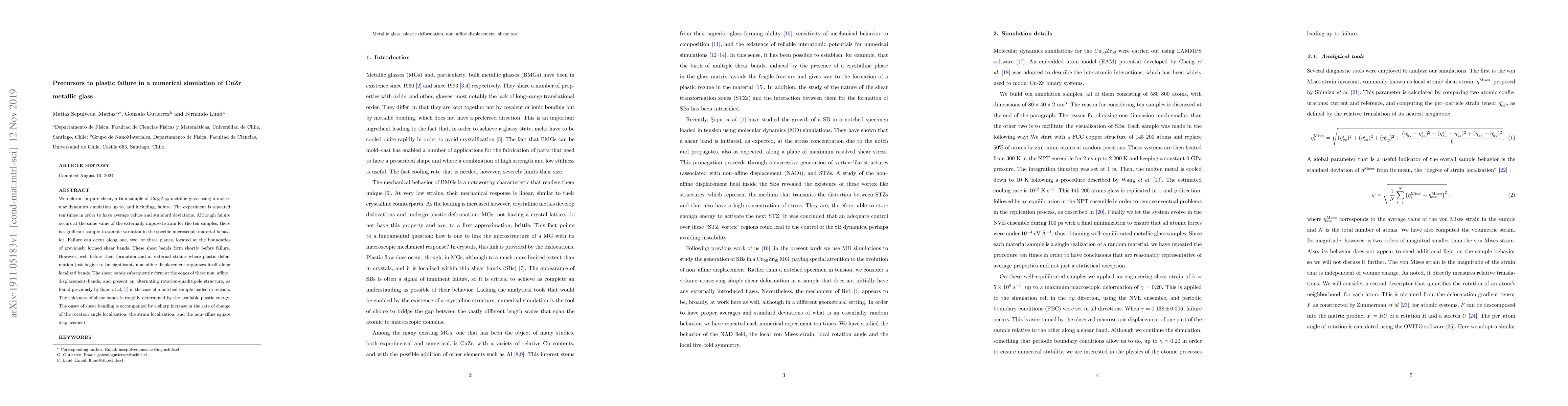 We deform, in pure shear, a thin sample of Cu$_{50}$Zr$_{50}$ metallic glass using a molecular dynamics simulation up to, and including, failure. The experiment is repeated ten times in order to have average values and standard deviations. Although failure occurs at the same value of the externally imposed strain for the ten samples, there is significant sample-to-sample variation in the specific microscopic material behavior. Failure can occur along one, two, or three planes, located at the boundaries of previously formed shear bands. These shear bands form shortly before failure. However, well before their formation and at external strains where plastic deformation just begins to be significant, non-affine displacement organizes itself along localized bands. The shear bands subsequently form at the edges of these non-affine-displacement-bands, and present an alternating rotation-quadrupole structure, as found previously by \c{S}opu et al. (2017) in the case of a notched sample loaded in tension. The thickness of shear bands is roughly determined by the available plastic energy. The onset of shear banding is accompanied by a sharp increase in the rate of change of the rotation angle localization, the strain localization, and the non-affine square displacement.