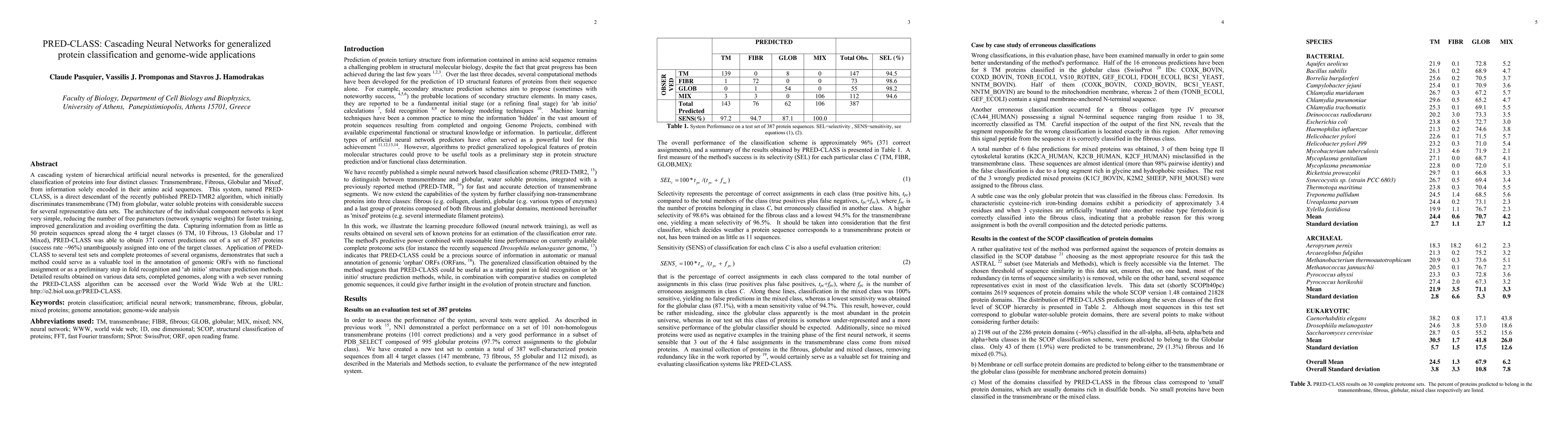 PRED-CLASS employs a cascading neural network system for classifying proteins into four main types based on amino acid sequences, achieving high accuracy with minimal training data. The method shows promise for genome-wide protein annotation and as a preliminary step in structure prediction.