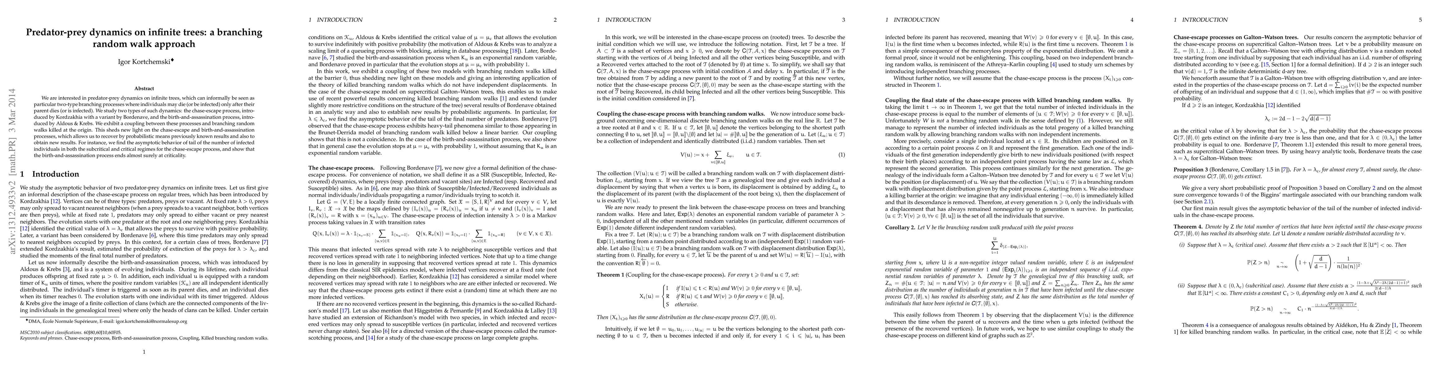 We are interested in predator-prey dynamics on infinite trees, which can informally be seen as particular two-type branching processes where individuals may die (or be infected) only after their parent dies (or is infected). We study two types of such dynamics: the chase-escape process, introduced by Kordzakhia with a variant by Bordenave, and the birth-and-assassination process, introduced by Aldous & Krebs. We exhibit a coupling between these processes and branching random walks starting from a random point and killed at the barrier 0. This sheds new light on the chase-escape and birth-and-assassination processes, which allows us to recover by probabilistic means previously known results and also to obtain new results. For instance, we find the asymptotic behavior of tail of the number of infected individuals in both the subcritical and critical regimes for the chase-escape process, and show that the birth-and-assassination process ends almost surely at criticality.